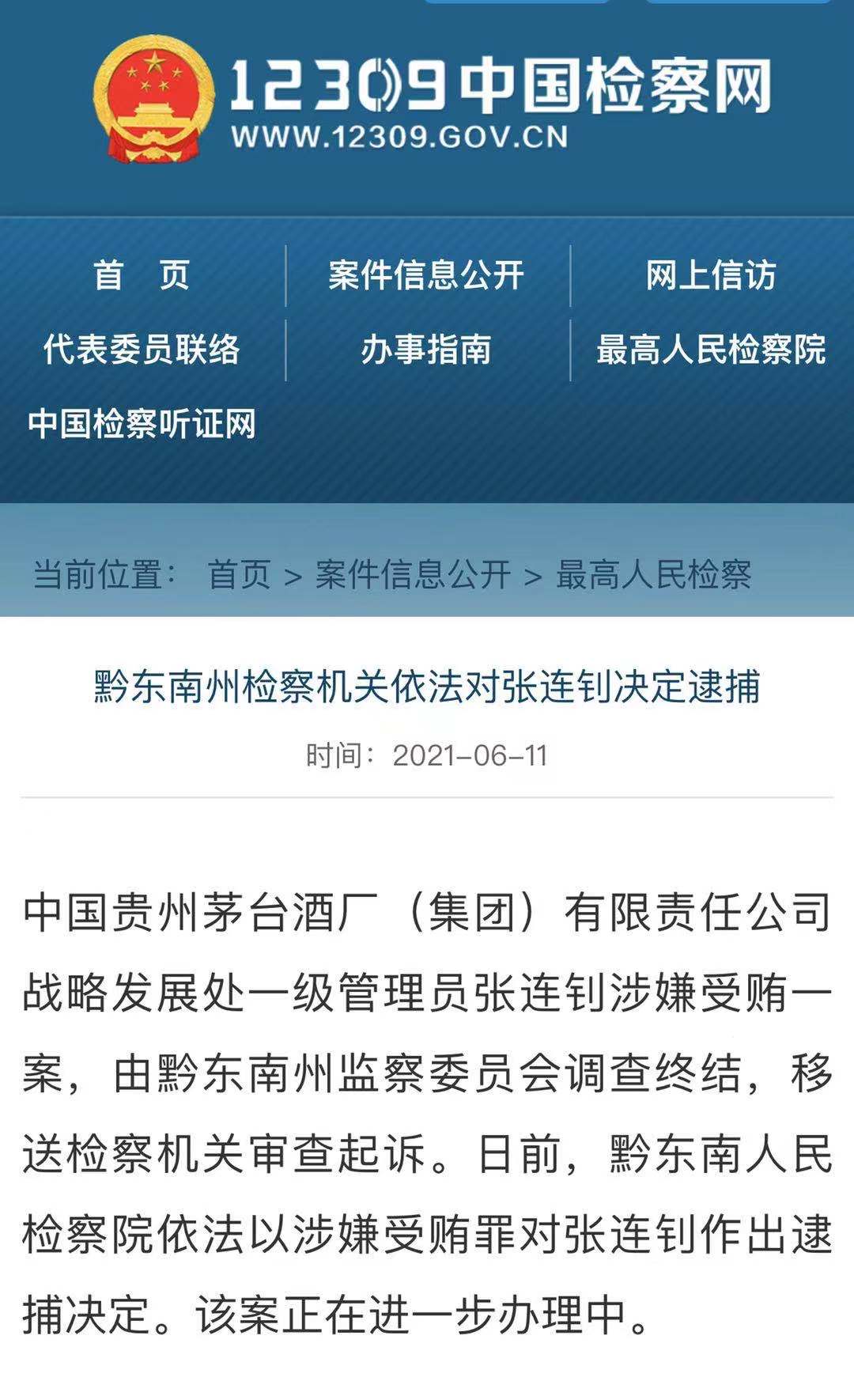 新京报讯 6月11日,记者从12309中国检察网上查询到,黔东南苗族侗族自治州人民检察院发布的一份案件信息显示,中国贵州茅台酒厂(集团)有限责任公司战略发展处一级管理员张连钊涉嫌受贿一案,由黔东南州监察委员会调查终结,移送检察机关审查起诉。日前,黔东南人民检察院依法以涉嫌受贿罪对张连钊作出逮捕决定。该案正在进一步办理中。