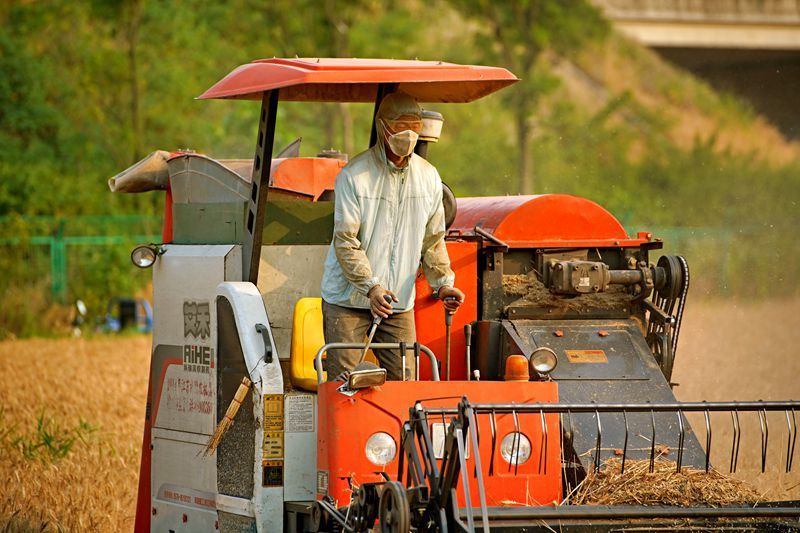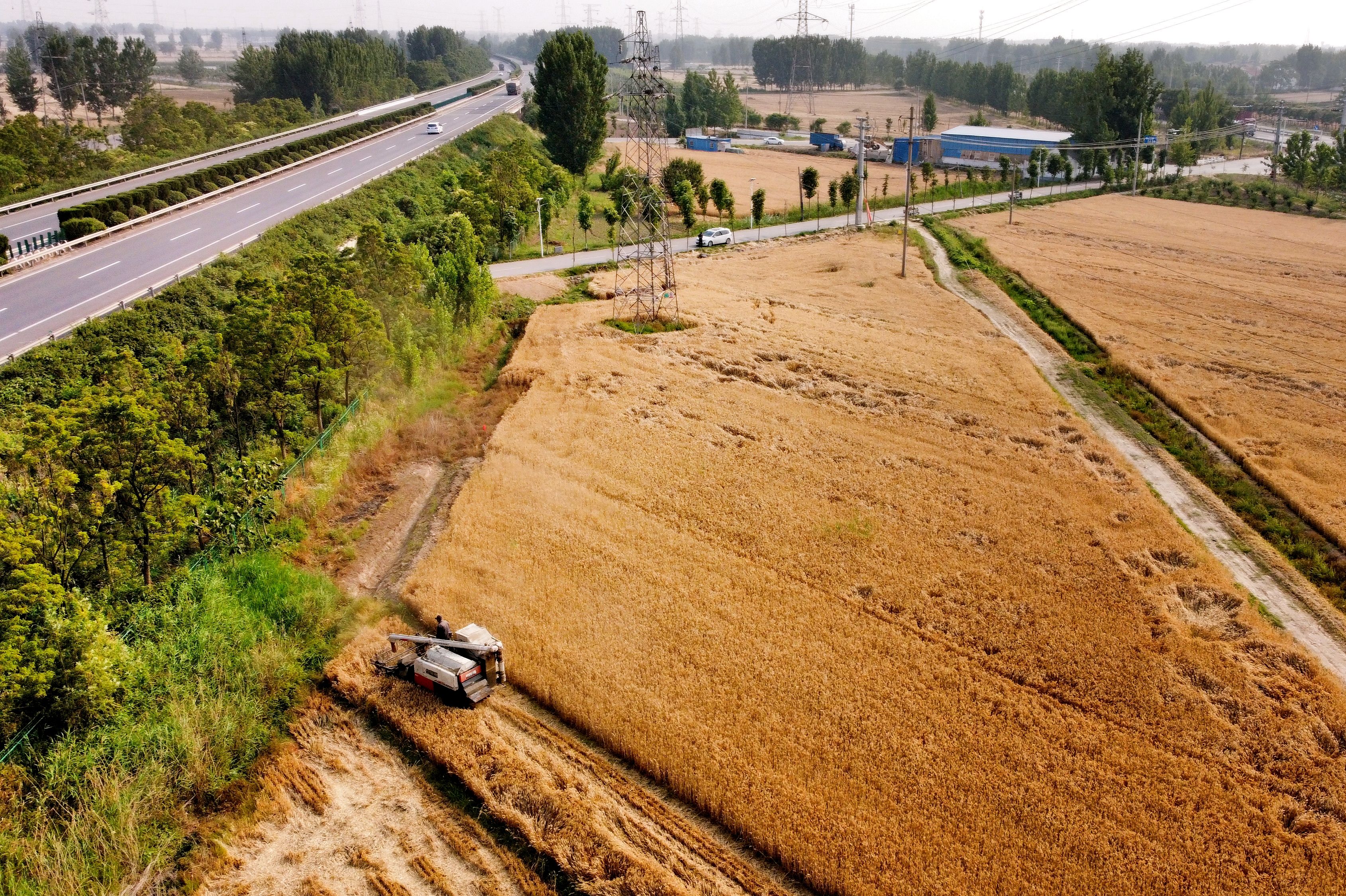 两条平行的铁路和公路,将大片的麦田分割成零碎的几小块,头顶上,高压线斜穿过高空,几座崭新的铁塔矗立在滚滚麦浪之中,一台小型收割机小心地绕开塔基,停在路边,把仓里的麦子倾倒在三轮车厢中。