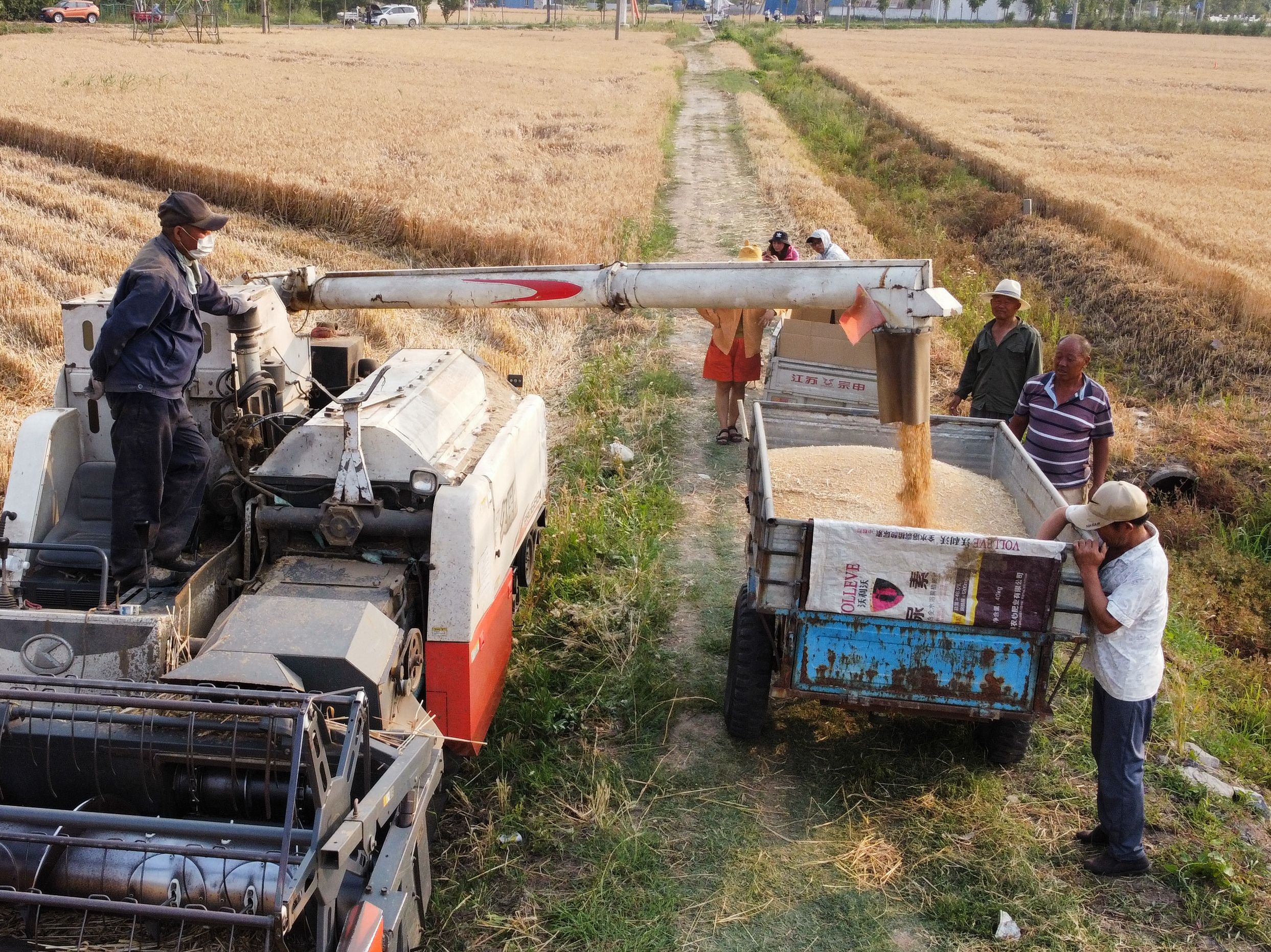 2021年6月10日,江苏徐州铜山区,麦收接近尾声,只剩下不多几个村子的稻田麦正在收割。