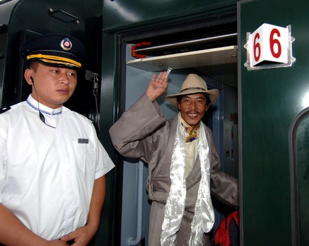 上午11点12分,随着长长的汽笛声,新建成的拉萨火车站驶出了西藏有史以来的第一趟列车——“藏2”次列车。西藏各地区各部门的代表乘坐了首列出藏列车。