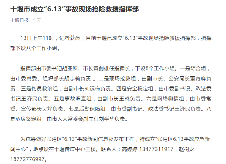 据十堰日报消息,13日上午11时,记者获悉,目前十堰已成立“6.13”事故现场抢险救援指挥部,指挥部下设八个工作小组。