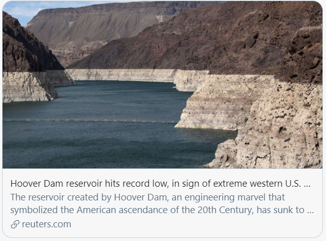 其中,没什么能比米德湖暴跌的水位更能凸显美国西部地区干旱严重性。胡佛水坝是美国综合开发科罗拉多河水资源的一项关键性工程,位于内华达州和亚利桑那州交界,而由胡佛水坝形成的水库——米德湖,是美国最大的水库,它直接关系到包括洛杉矶、圣地亚哥以及拉斯维加斯在内的2500万人的用水问题。就是这样一个具有重要意义的湖,近期水位却一降再降,引发民众忧虑。胡佛水坝水库的水位降至历史低点。/路透社报道截图
