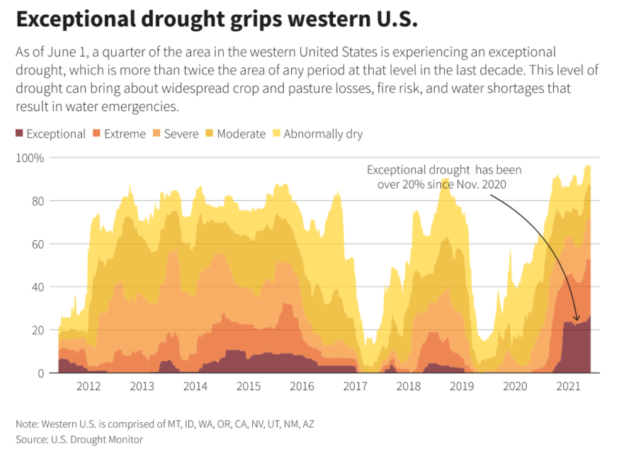截至当地时间6月9日,米德湖水位降至1071.56英尺,打破了其在2016年创下的历史最低水位纪录,其水容量也只剩下原本的36%。不过,这仍不是终点。美国垦务局(Bureau of Reclamation)发言人Patricia Aaron表示,预计米德湖的水位将会持续下降,直到2021年11月。事实上,此次席卷美国西部的干旱并不是孤立事件。美国西南部地区干旱已经持续了20多年,俄勒冈州、怀俄明州、加利福尼亚州和新墨西哥州等9个州自2000年以来,就开始出现干旱。2012年至2021年美国西部地区干旱情况。/路透社报道截图