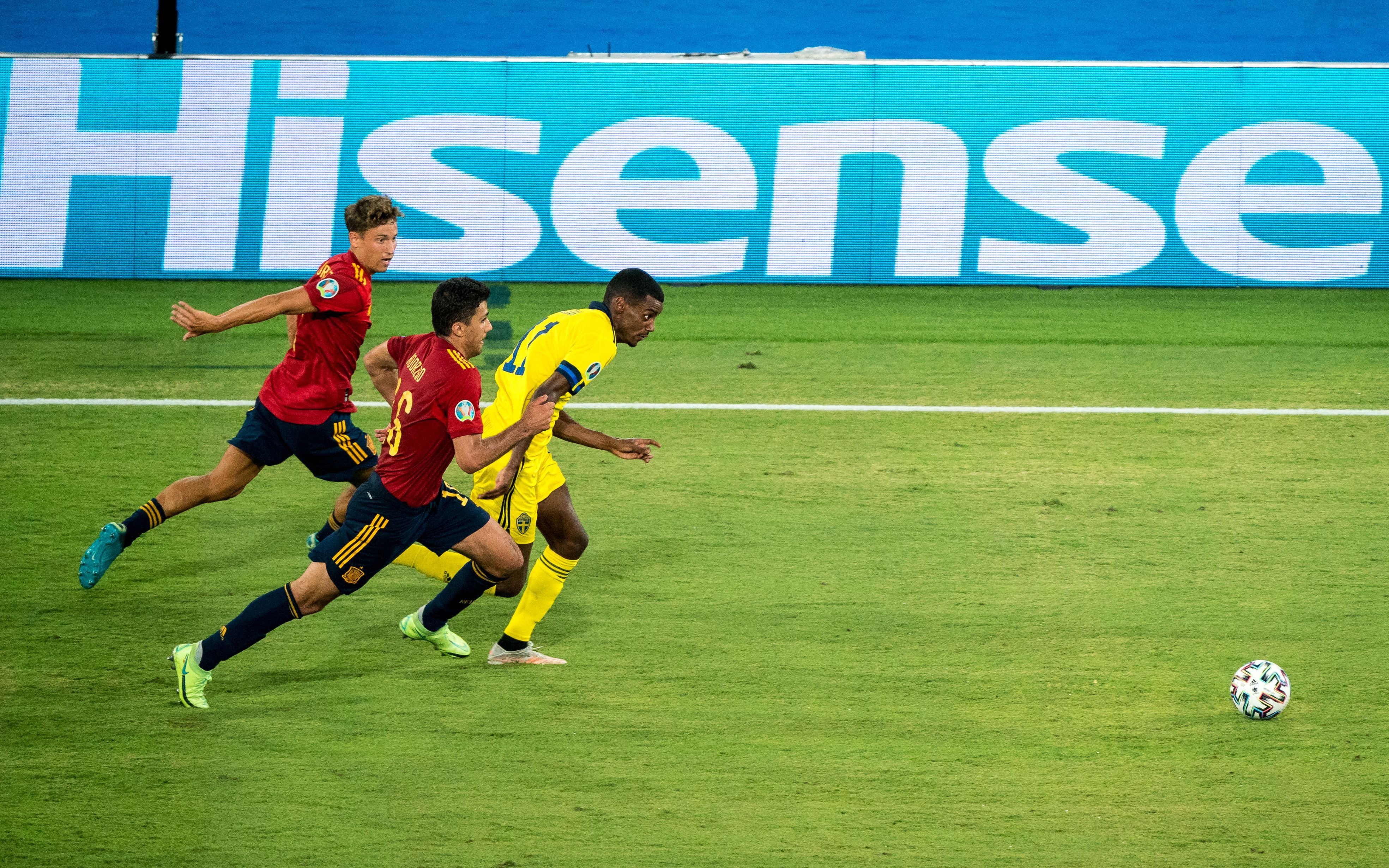 西班牙球员与瑞典球员比拼速度。