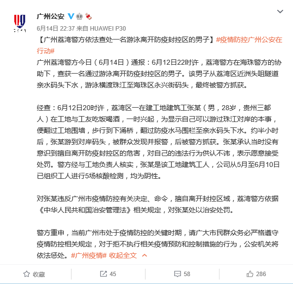 ▲广州荔湾警方通报依法查处一名游泳离开防疫封控区的男子。图片来源:广州公安官方微博截图