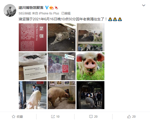 新京报快讯 据建川博物馆官方微博消息,猪坚强于2021年6月16日晚10点50分因年老衰竭去世。