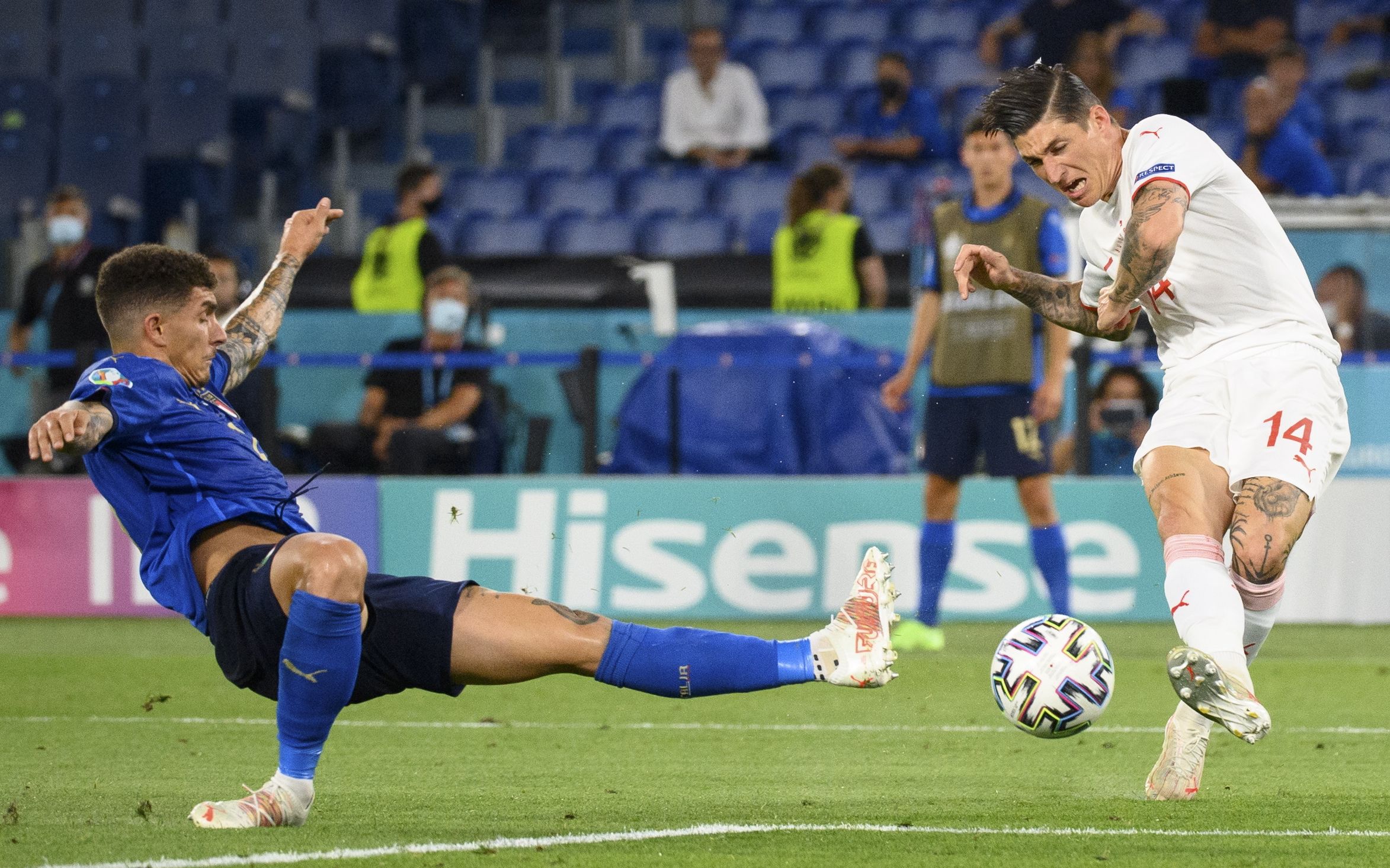 比赛第26分钟,效力于萨索洛的洛卡特利率先推射破门。第52分钟,洛卡特利梅开二度,他在禁区弧顶处接巴雷拉传球远射破门,意大利2比0领先。瑞士队在第64分钟打出两次颇有威胁的射门,但都被意大利队门将多纳鲁马封堵。终场前,因莫比莱锦上添花。3比0完胜瑞士后,意大利以两连胜的战绩提前晋级16强。