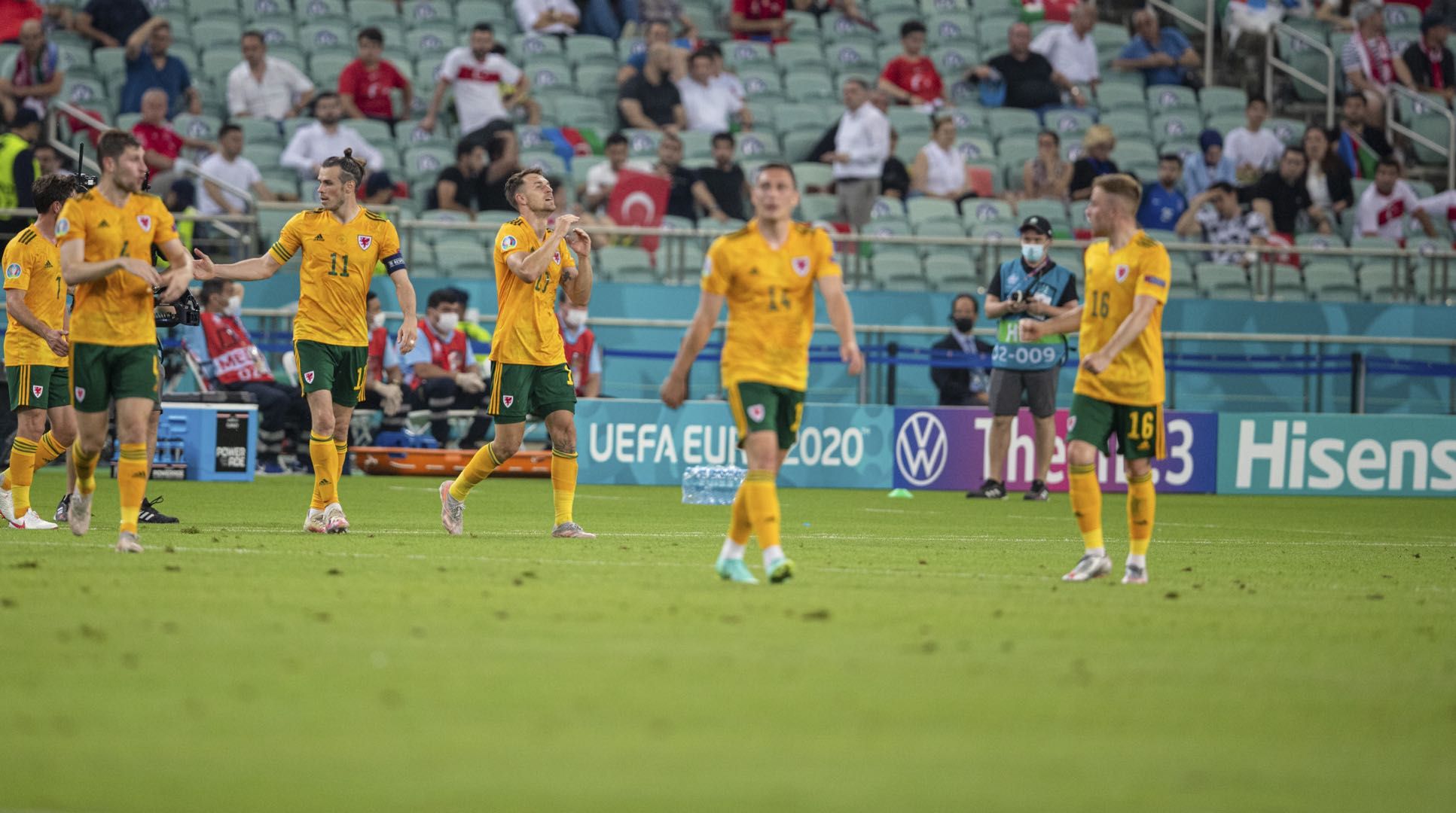 与土耳其的较量,贝尔本有机会攻入2019年10月以来的威尔士首球。比赛进行到第60分钟,贝尔突破到禁区边缘被绊倒,裁判果断判罚点球,他亲自主罚却将皮球踢到了门框之外,错失扩大比分的良机。