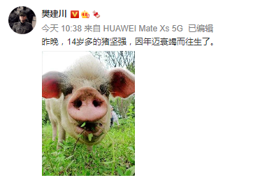 “昨晚,14岁多的猪坚强,因年迈衰竭而往生了。”