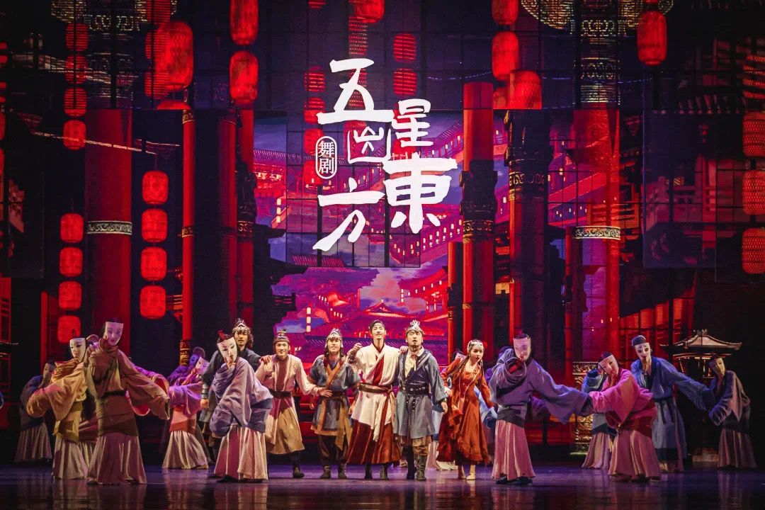 舞剧《五星出东方》由中共北京市委宣传部、中共新疆维吾尔自治区党委宣传部联合出品,北京演艺集团联合北京市援疆和田指挥部、和田地委宣传部共同制作,北京歌剧舞剧院、新疆新玉歌舞团演出,是庆祝中国共产党成立100周年优秀舞台艺术作品展演剧目。该剧以新疆和田尼雅遗址出土的五星出东方利中国织锦护臂为题材,讲述了汉朝戍边将领奉在精绝古城与北人首领之子建特、精绝首领之女春君之间,从剑拔弩张到并肩携手、从素不相识到深深认同,结下深厚情谊的动人故事,诠释了各族人民“像石榴籽一样紧紧抱在一起”,结成中华民族命运共同体的主题。