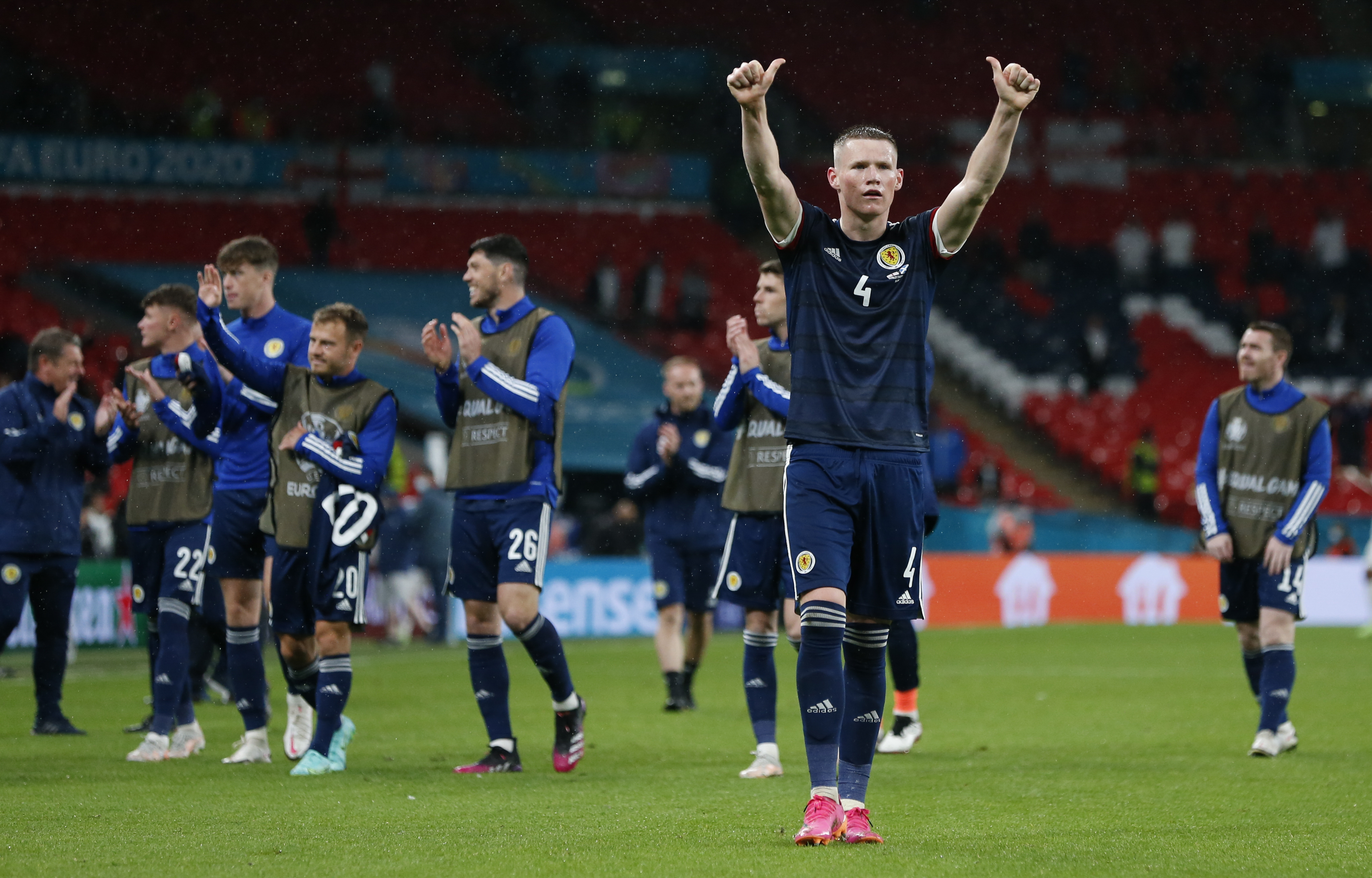 苏格兰逼平英格兰,麦克托米奈给球迷点赞。图/新华社