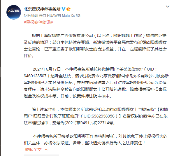 此外,另一起欧阳娜娜与某网络用户的名誉权纠纷案亦已在依法审理过程中。