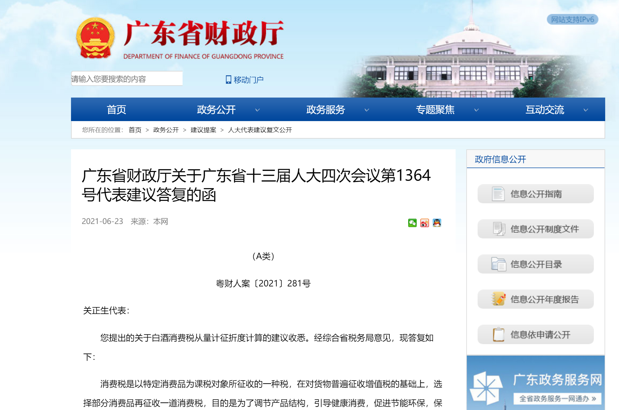 新京报讯 6月24日,记者从广东省财政厅官方网站了解到,广东省财政厅关于广东省十三届人大四次会议第1364号代表建议答复的函显示,有人大代表提出的白酒消费税从量计征折度计算的建议,经综合省税务局意见,答复称“目前,国家正在加紧推进消费税法立法,在前期征求意见阶段我们已反馈了有关意见和建议,其中包括建议按白酒不同度数设定不同比例税率或取消从量定额等”。
