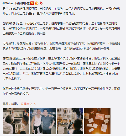 新京报讯 6月24日,陈伟霆在微博发文并晒出片场照,透露他和王千源主演的电影《暴风》杀青。陈伟霆在文中透露跟陈嘉上导演合作很激动,还提到自己为了诠释好角色晒黑的经历。陈伟霆表示:“陈家栋这个角色就像处在暴风中。他一直在一个漩涡里,为了相信的一束光拼命往前跑,期待你们与陈家栋的相见。”