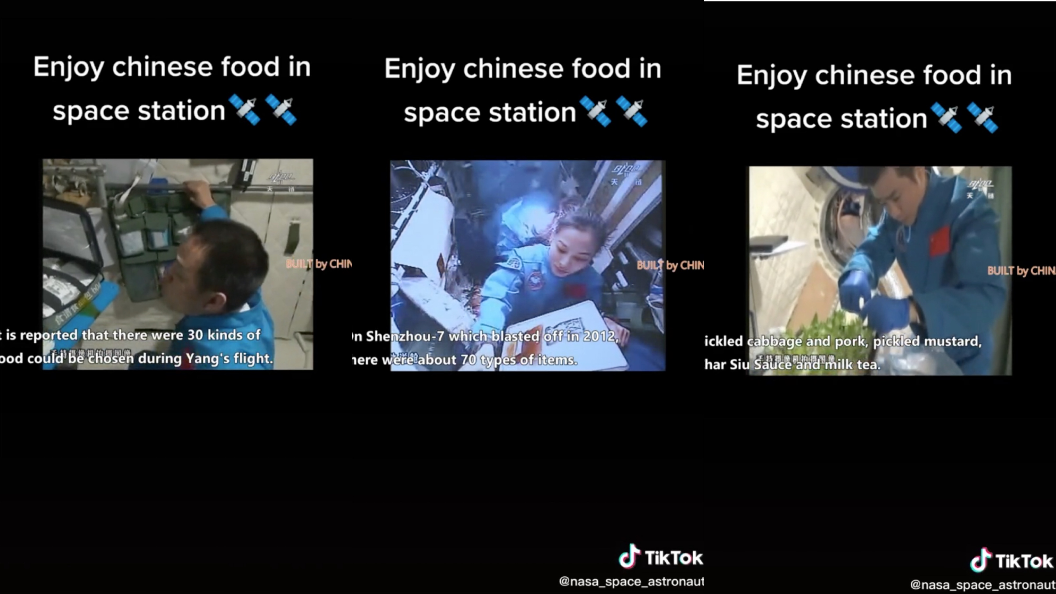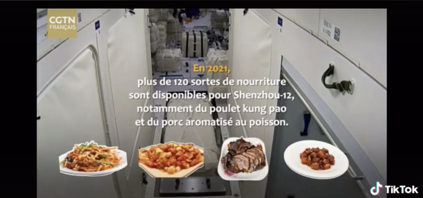 6月23日,3名航天员在中国空间站内用餐画面公布。视频中,航天员们把早餐餐包固定在桌面上,聚在一起吃早餐。TikTok用户介绍,中国空间站为航天员配置了120多种航天食品,其中不乏“鱼香肉丝”“宫保鸡丁”等中式菜品的身影。除了各种菜品,航天员还能喝到茶、果汁和汤。此外,航天食品根据航天员个人口味,实现最大程度个性化。