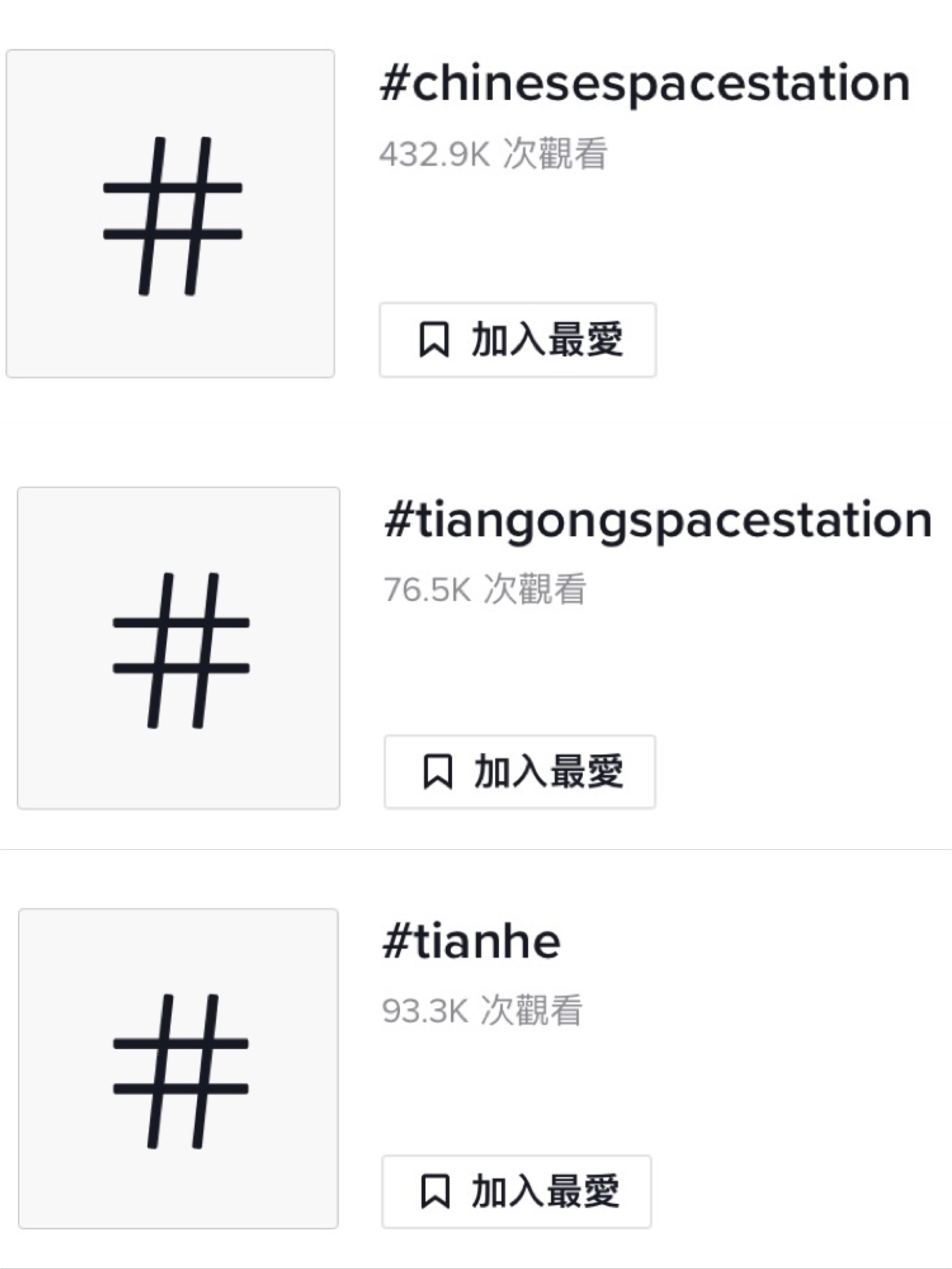 三名中国航天员顺利进入天宫空间站天和核心舱,成为第一批进入空间站核心舱的航天员,也标志着中国人首次进入自己的空间站。在TikTok上,“中国空间站”相关话题的热度攀升,仅#chinesespacestation(中国空间站)、#tiangongspacestation(天宫空间站)、#tianhe(天和)三个词条的阅读量就已达60万。