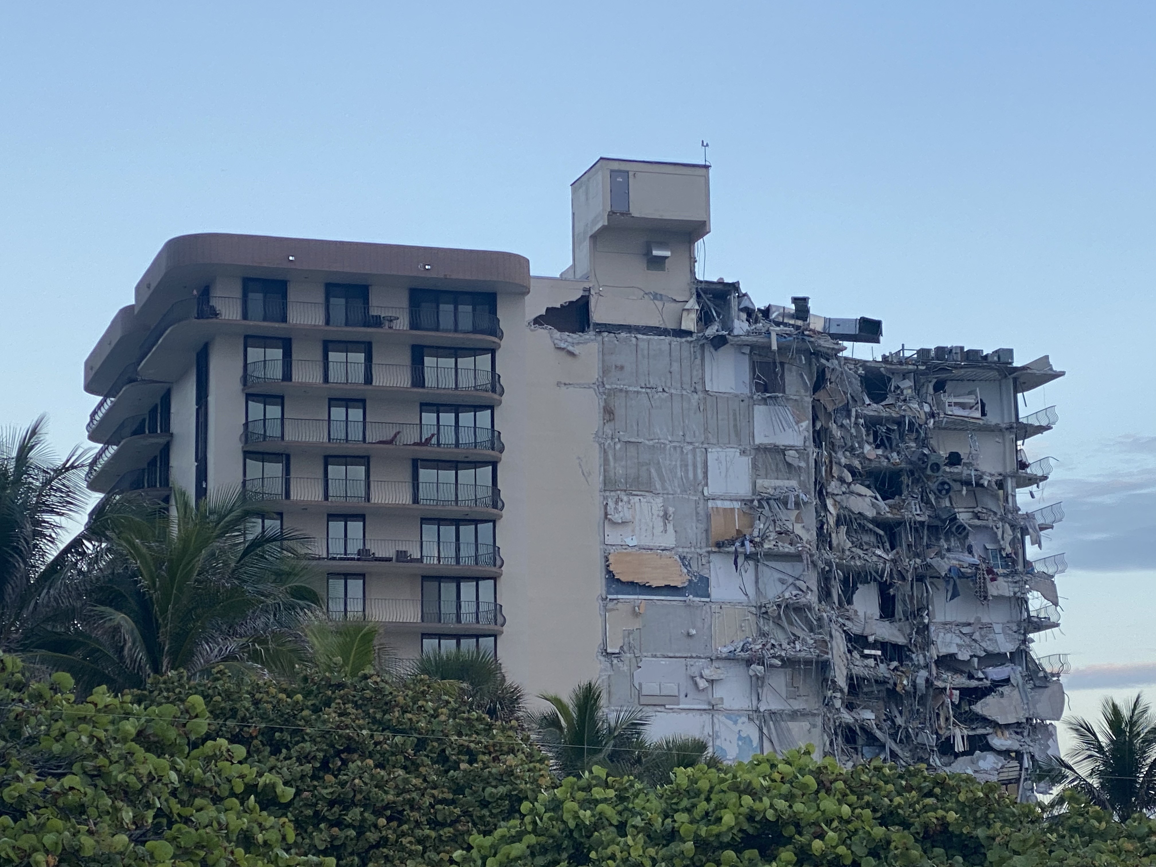 航拍对比:美公寓楼倒塌99人下落不明,楼体被削去三分之二。