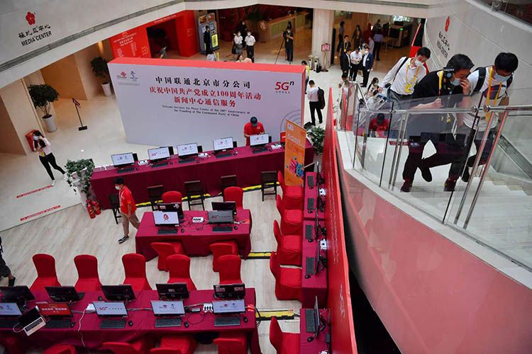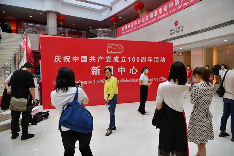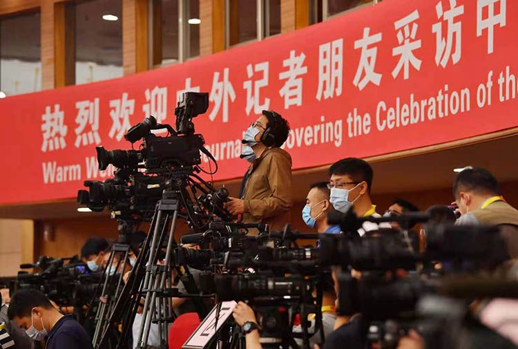 中外记者现场采访庆祝中国共产党成立100周年活动新闻中心首场发布会。