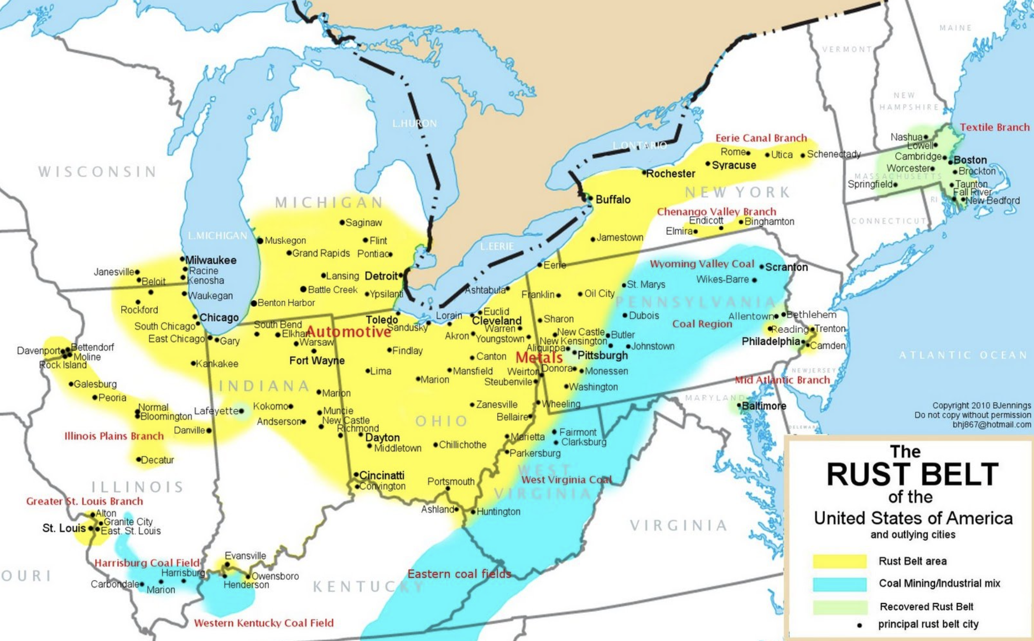 因此,我们似乎矛盾地看到,美国、英国和法国这些通常来说创新水平最高的国家,自20世纪70年代以来有大片地区“被去工业化洗劫”,用法国总统马克龙的话说:美国的“锈带”从阿巴拉契亚山脉一直延伸到美国中西部、英国的西米德兰兹和法国的洛林地区。在这些地区的旧工业中,创新似乎大面积消失了——其消失的幅度如此巨大,以至加上新的高科技行业惊人的创新成果也没能挽回总体的衰落趋势。但是一个发达的经济体往往有着复杂的结构。我们可以想象,这些地区投资和就业的下降是由创新结构的变化引起的,而不是创新的衰落导致的。