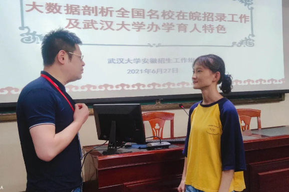 6月24日,武大安徽招生组工作人员在安庆一中与欧阳程程见面。图片来源:武大安徽招生组