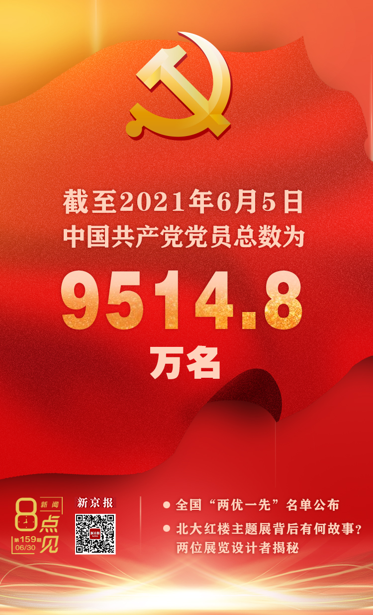 中央组织部最新党内统计数据显示,截至2021年6月5日,中国共产党党员总数为9514.8万名,比2019年底净增323.4万名,增幅为3.5%。中国共产党现有基层组织486.4万个,比2019年底净增18.2万个,增幅为3.9%。