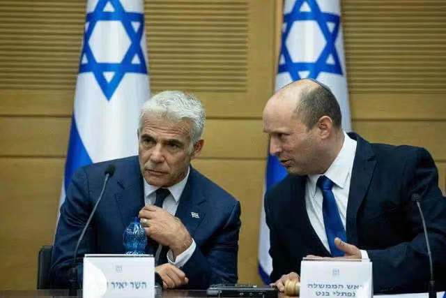 ▲6月13日,以色列新任总理贝内特(右)和外交部长拉皮德在耶路撒冷参加新一届政府第一次内阁会议。图片来源:新华社