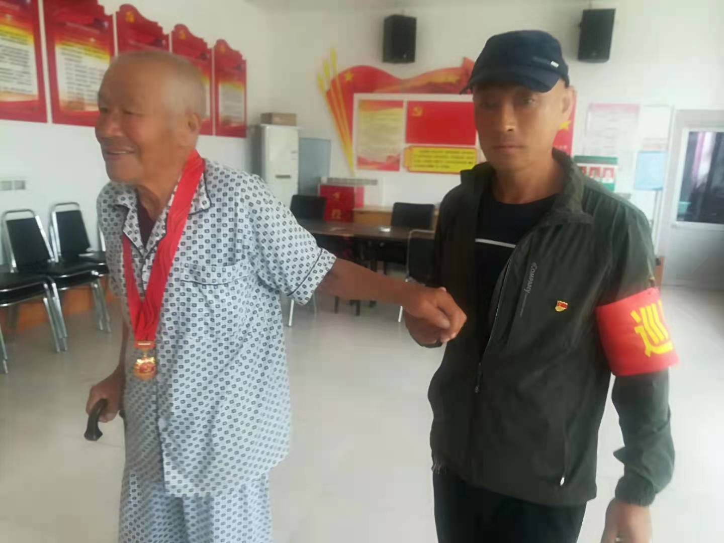 86岁的王仕啟,在霹破石村党支部书记杨忠云的搀扶下参加了这次直播观看活动。受访者供图
