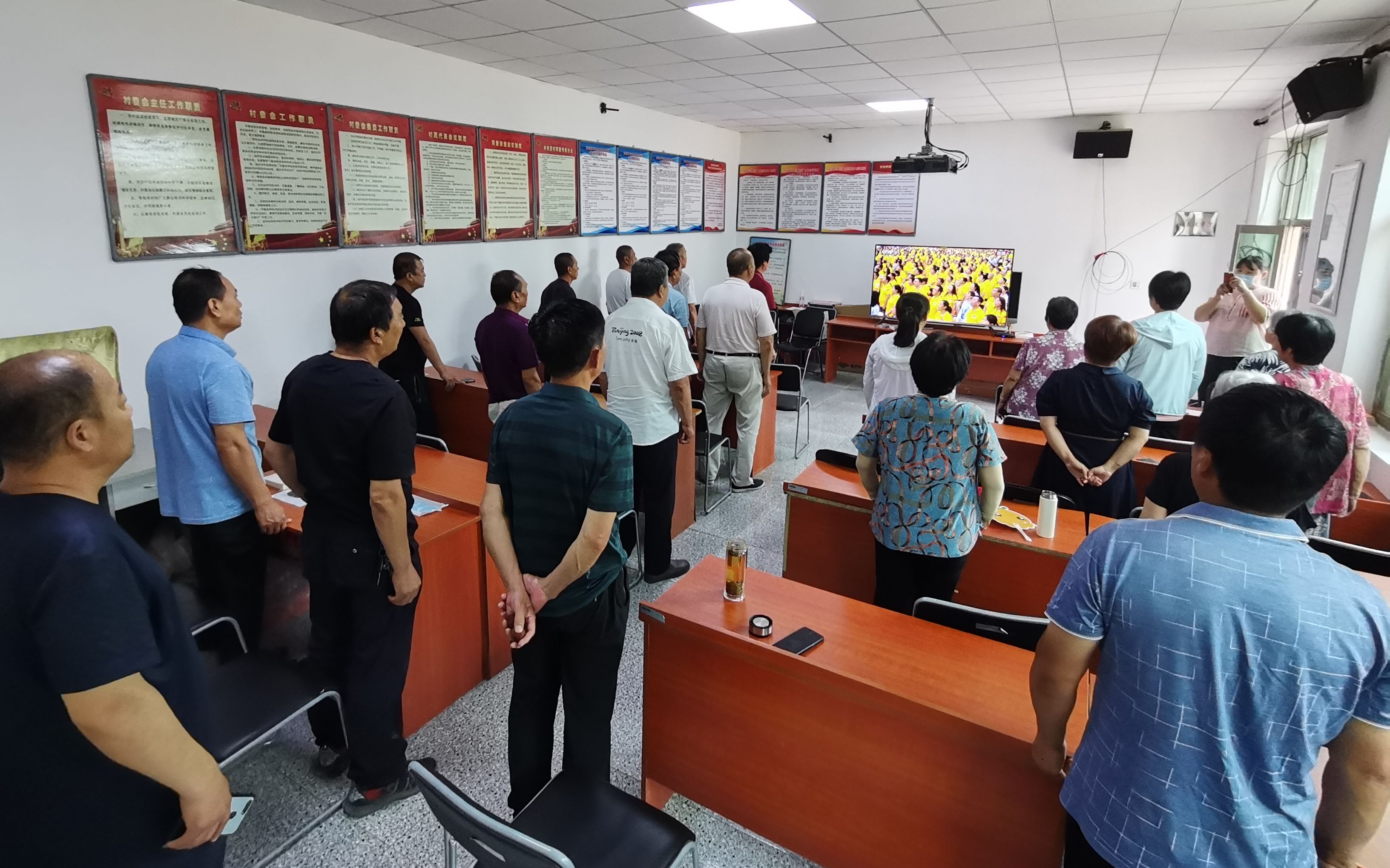7月1日,兴安营村党员在电视机前,全体肃立观看升国旗。受访者供图