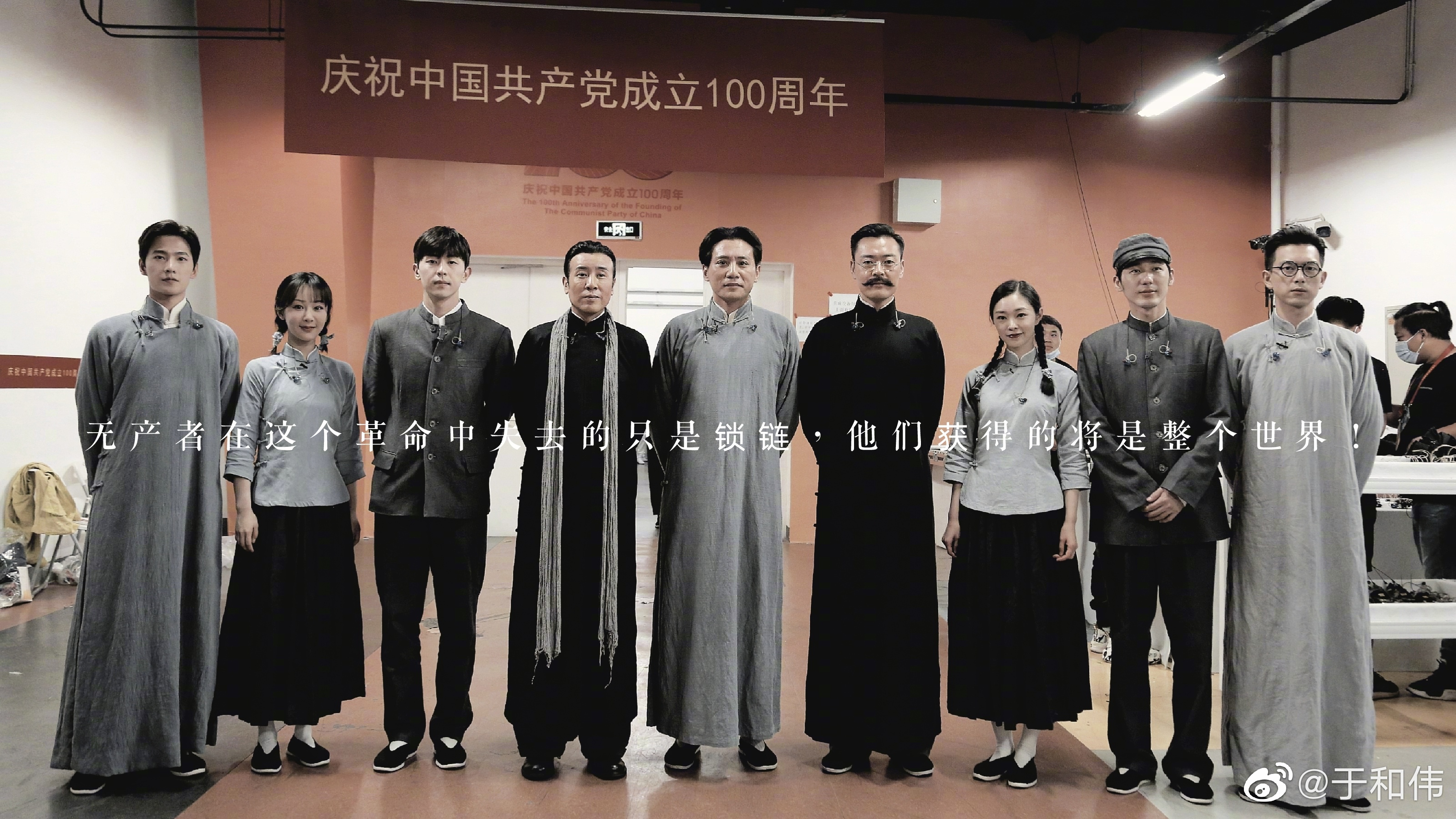 新京报讯 7月1日晚,庆祝中国共产党成立100周年文艺演出《伟大征程》在中央广播电视总台播出。当晚,参加文艺演出的于和伟在社交媒体上分享了演出的后台合影。演出中,他与张桐、刘烨、白宇、邓伦、宋轶、杨洋、李现、杨紫共同表演戏剧与舞蹈节目《破晓》,再演《觉醒年代》中的片段。