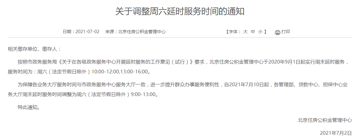 7月10日起,北京住房公积金业务周六办理时间有调整