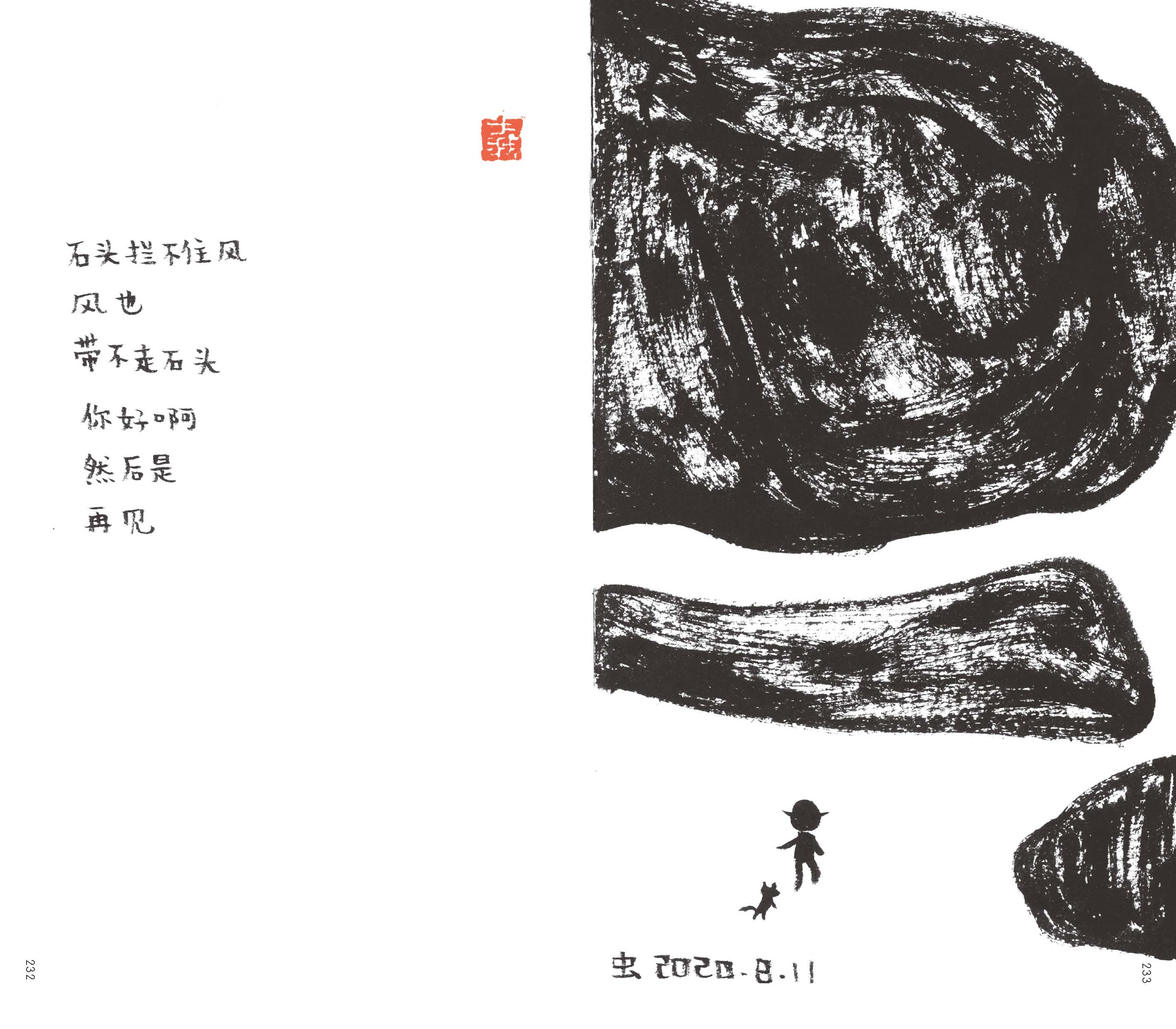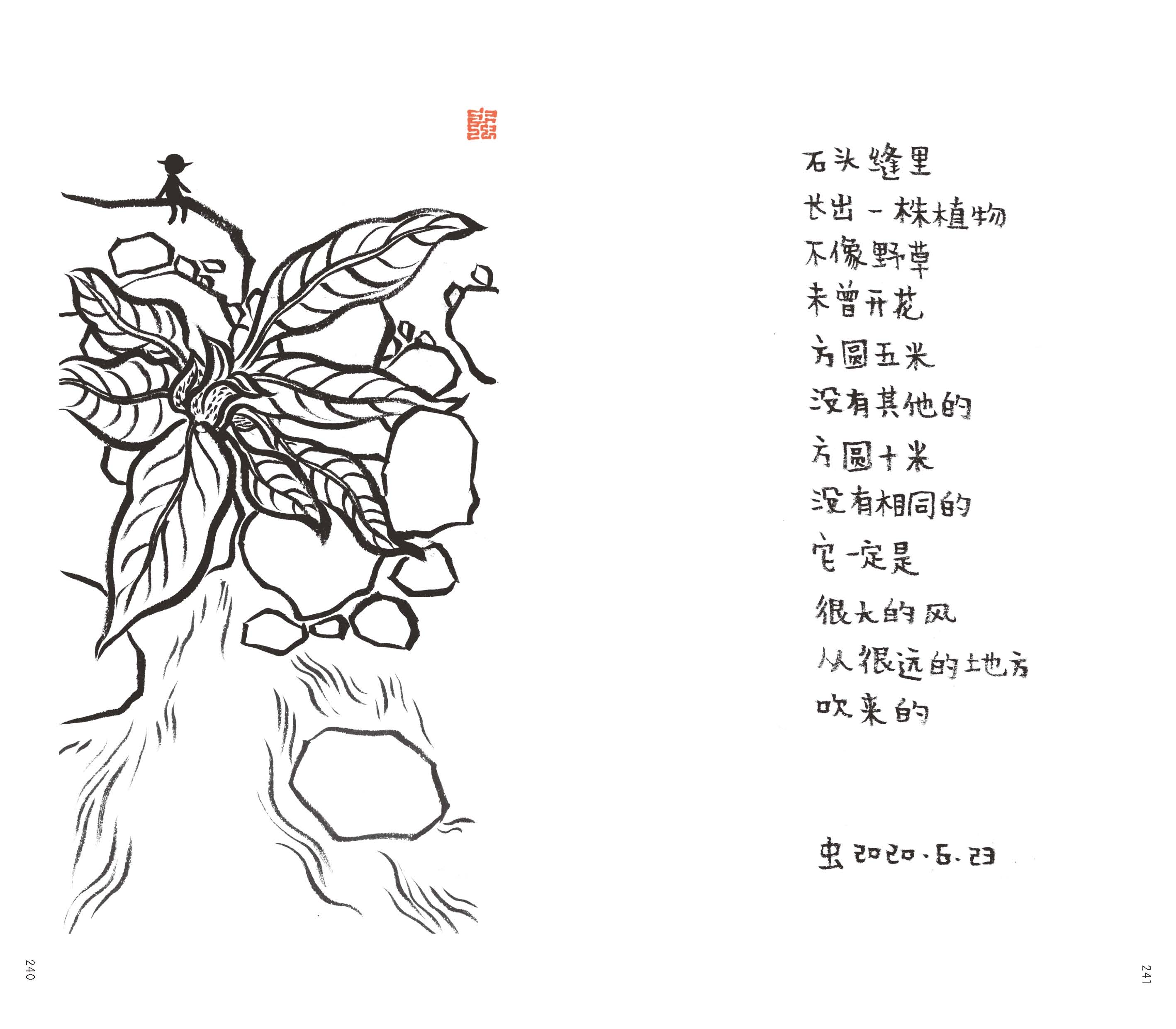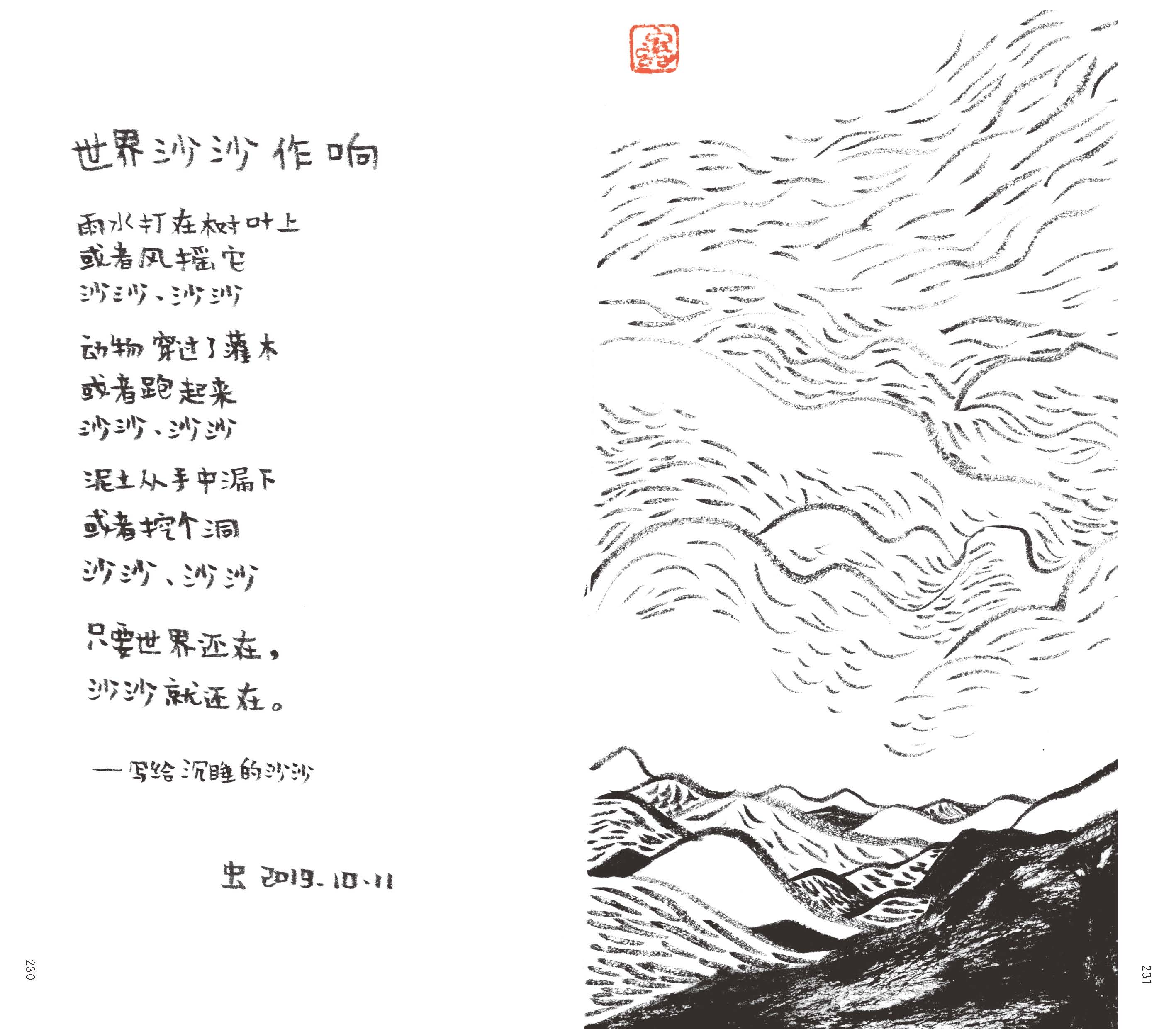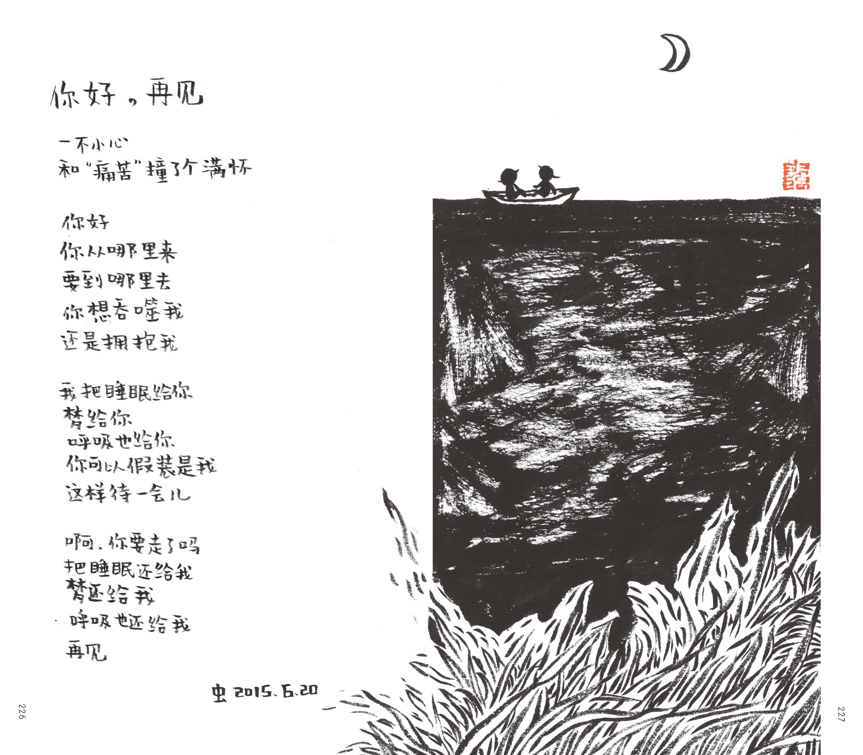 有一次,我发现,我写的两首诗有共通之处,它们相距近五年,但那个“ 我”已经截然不同。五年之间,我看到,所有的经历都可以变成诗,或者变成画。我借着它们来诉说一切:快乐、悲伤、失望、痛苦、感动……在许多时刻,诗和画又完全相通,互为补充。它们一起组织起生活的碎片,重新建构我。并且,一再地安慰我。