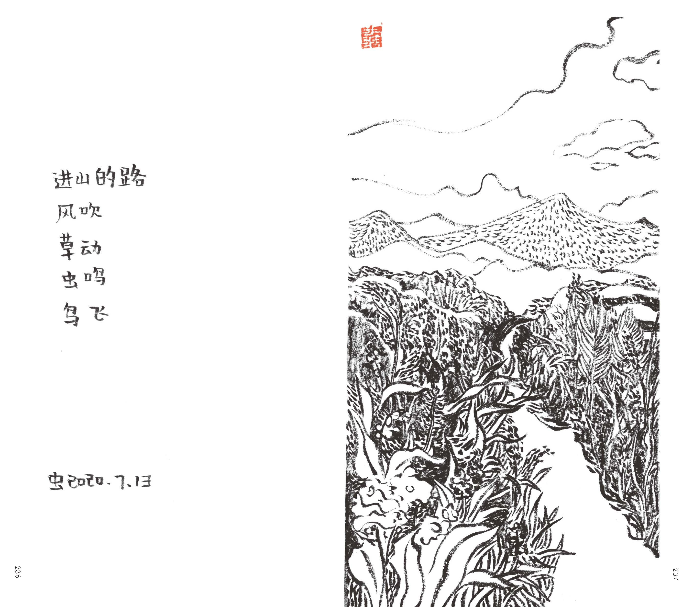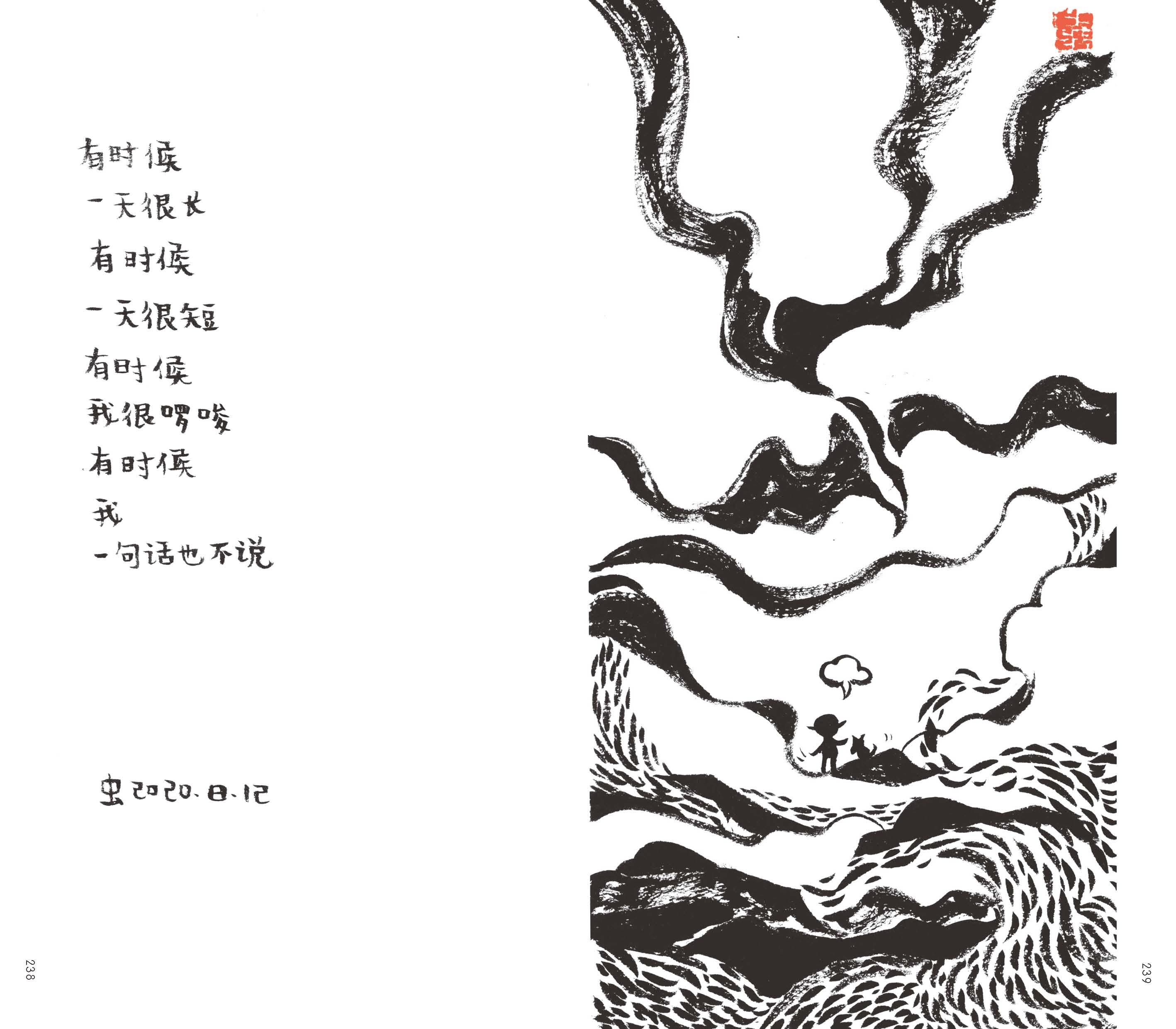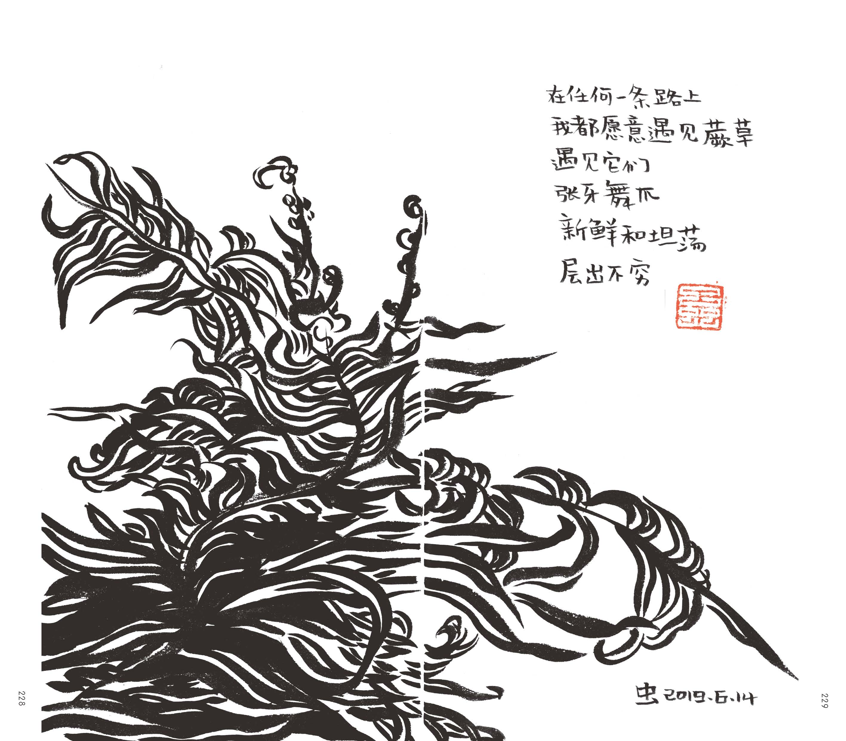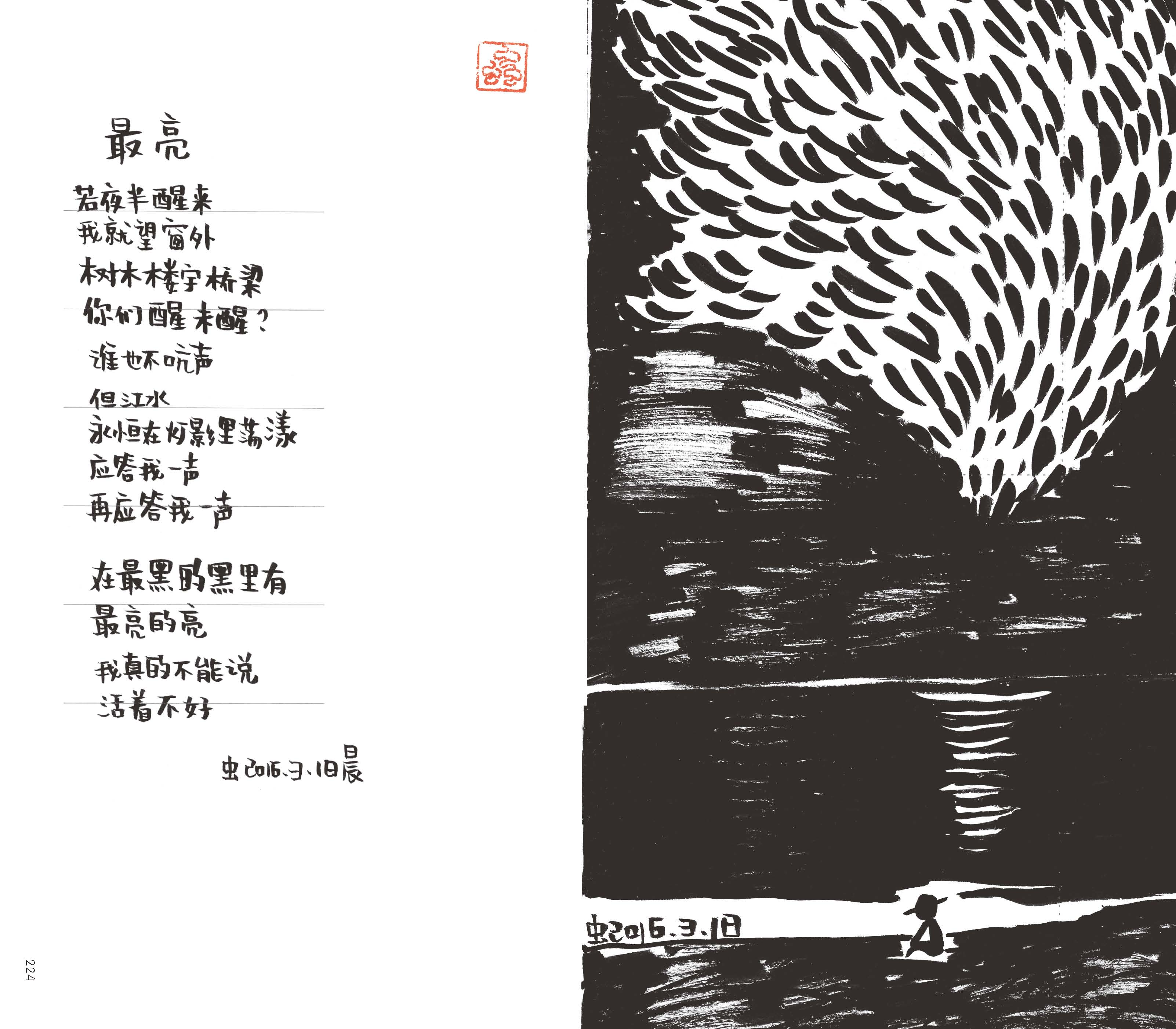 有一次,我发现,我写的两首诗有共通之处,它们相距近五年,但那个“ 我”已经截然不同。五年之间,我看到,所有的经历都可以变成诗,或者变成画。我借着它们来诉说一切:快乐、悲伤、失望、痛苦、感动……在许多时刻,诗和画又完全相通,互为补充。它们一起组织起生活的碎片,重新建构我。并且,一再地安慰我。