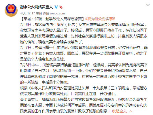 新京报快讯 据河北衡水市公安局官方微博消息,近日,阜城县侦破一起篡改他人高考志愿案。7月6日,辖区高考考生周某(化名)及其家属来阜城县公安局城镇派出所报案,称发现其高考志愿被人篡改了。接报后,民警立即展开侦查工作,在详细询问了受害人及其家属事情的经过后,对其社会关系进行摸排走访,排查其家人误报志愿的情况,确定周某志愿确实被篡改了。