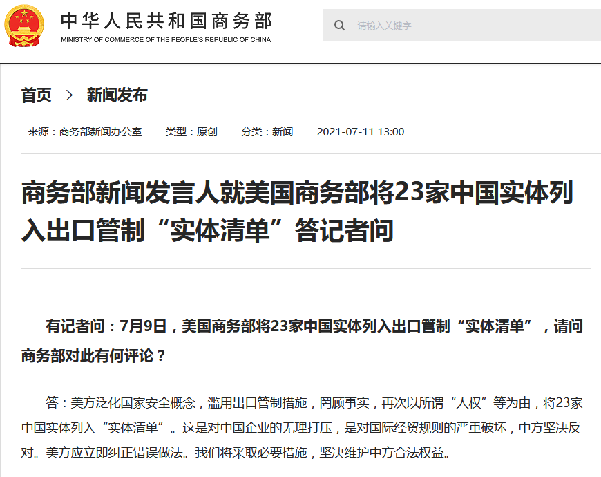 ▲商务部新闻发言人就美国商务部将23家中国实体列入出口管制“实体清单”答记者问。图片来源:商务部网站截图