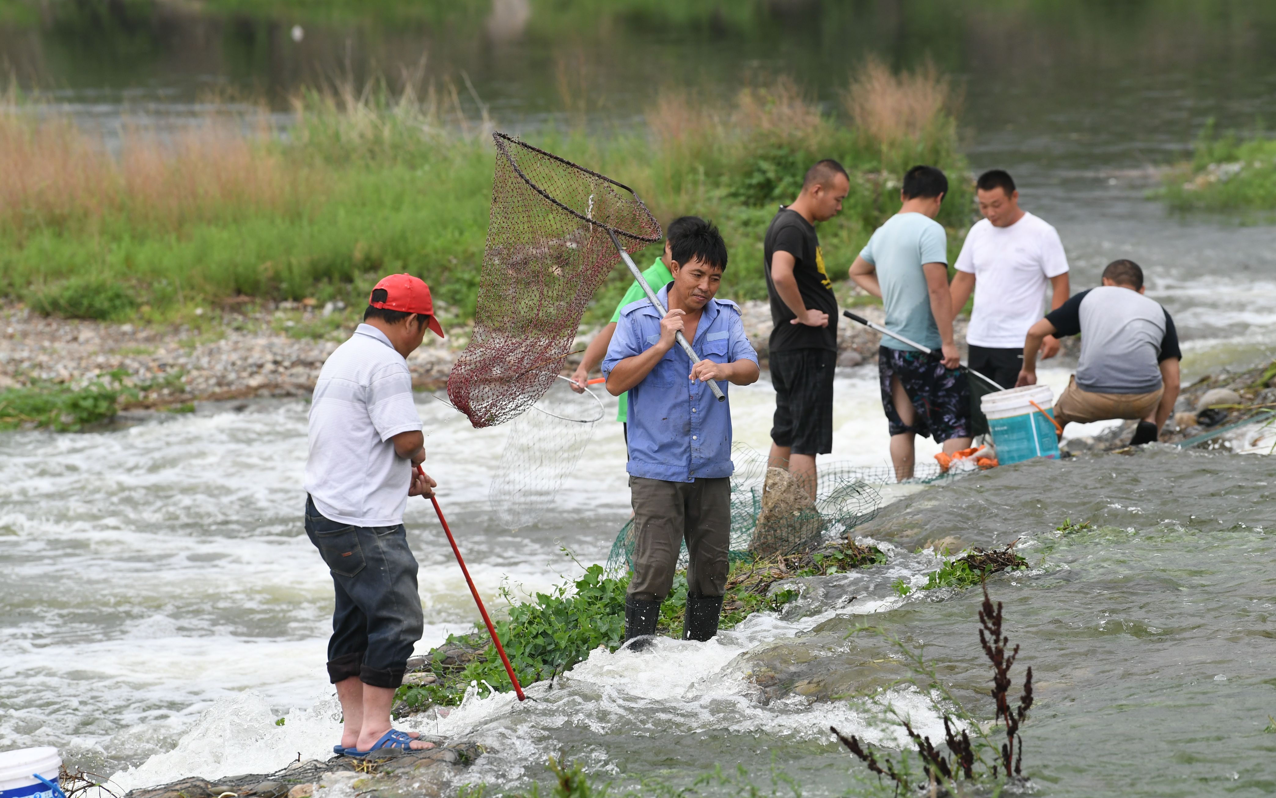 7月12日下午, 雨后的房山大石河边,居民成群结队戏水、捕鱼。新京报记者 王颖 拍摄 制作