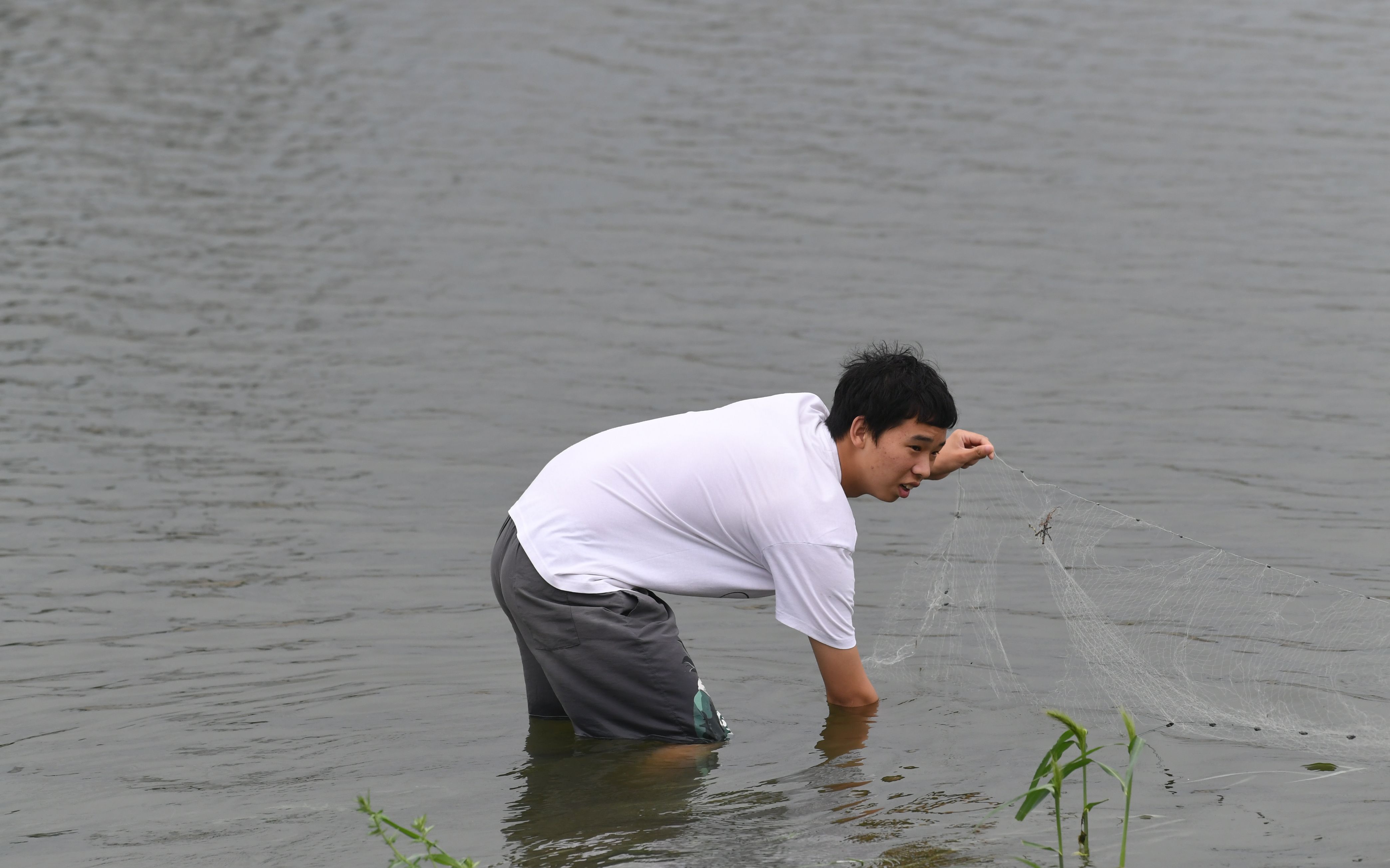 在河水中还有人撒网捕鱼。新京报记者 王颖 摄