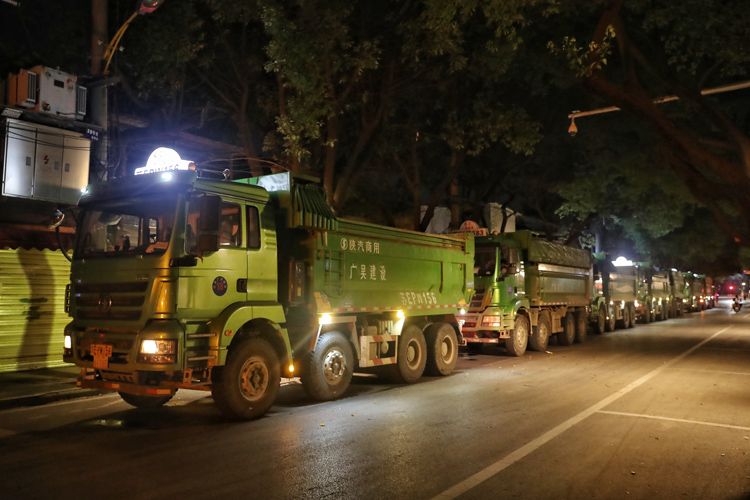 7月13日晚,吴江区松陵街道油车路,8辆渣土车等待进入救援现场运送渣土。