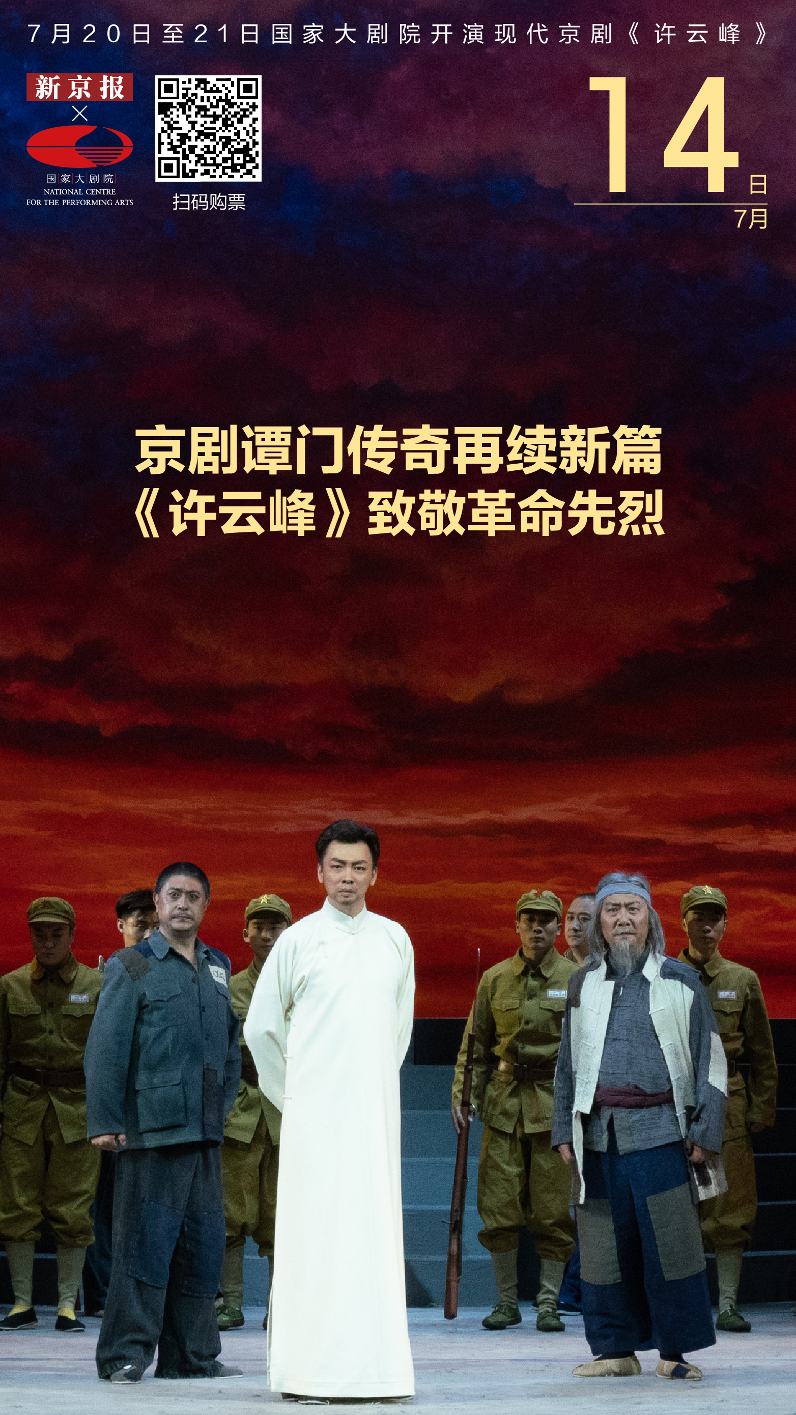现代京剧《许云峰》是北京京剧院对近40年前创作的经典剧目《红岩》进行深度挖掘、整理,再度创排改编的作品。该剧取材于著名长篇小说《红岩》,讲述了重庆地下党工委书记许云峰在接受组织营救歌乐山集中营难友的任务时遭遇叛徒出卖而被捕关入集中营,在狱中组织狱友们与反动派展开智斗,拒绝独自越狱,最终被反动派杀害的故事。7月20日至21日,北京京剧院现代京剧《许云峰》将在国家大剧院上演。