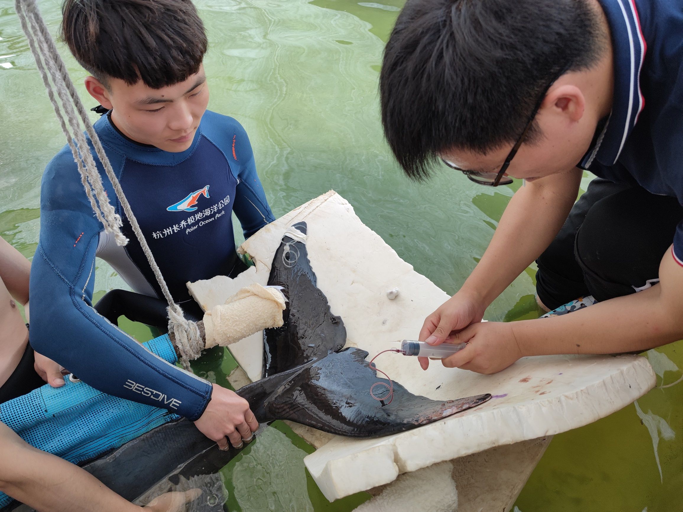 7月13日下午1点45分左右,救援人员对瓜头鲸进行抽血。图源临海市委宣传部