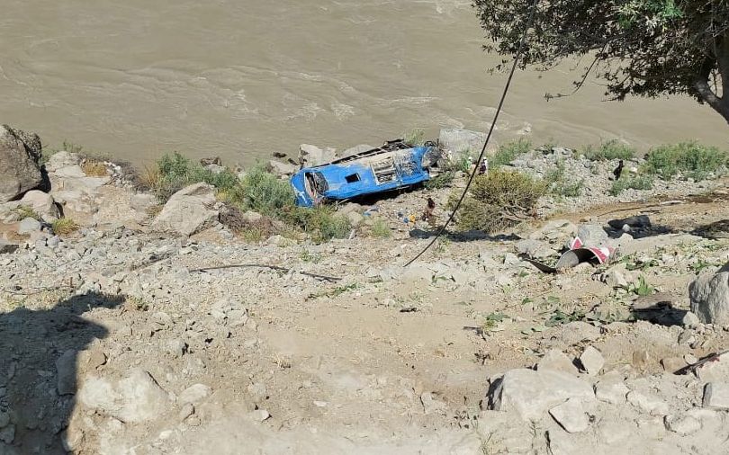 当地时间7月14日,巴基斯坦,中方企业承建的开普省达苏水电站项目出勤班车在赴施工现场途中遭遇爆炸。图为坠河的车辆。/IC photo