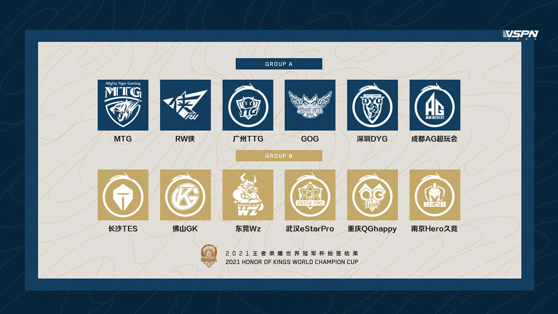 7月14日,世冠杯抽签仪式揭晓了分组情况:MTG、RW侠、广州TTG、GOG、深圳DYG、成都AG超玩会进入A组;长沙TES、佛山GK、东莞Wz、武汉eStarPro、重庆QGhappy、南京Hero久竞则被分在B组。哪支战队能将金凤凰杯和丰厚奖金收入囊中,成为这个夏天王者荣耀世冠杯的最大悬念。