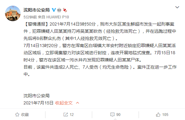 新京报快讯 7月15日,辽宁省沈阳市公安局通过其官方微博发布一则警情通报: