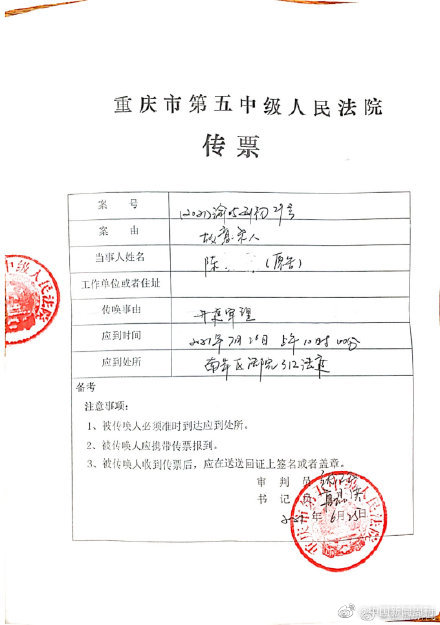 ▲重庆市第五中级人民法院传票显示,本案将在7月26日开庭审理。图片来源:微博博主@睿瑞的妈妈(亡故孩子的母亲)