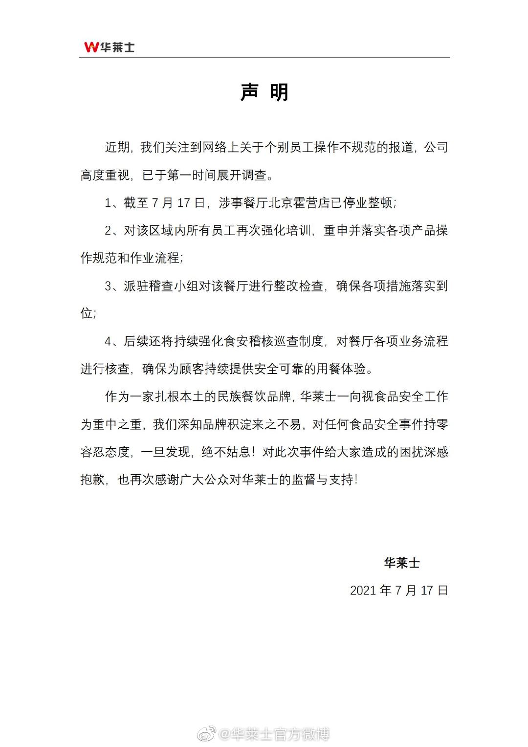 新京报讯(记者 王萍)针对华莱士被曝光后厨一系列操作不规范问题,7月17日晚,华莱士通过其官方微博发出声明致歉,表示涉事餐厅为北京霍营店,已停业整顿,并派驻稽查小组对该餐厅进行整改检查。