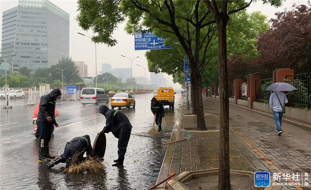 7月18日,在北京市中关村北四环西路,中关村街道工作人员清扫积水,打开下水井盖加速排水(手机照片)。新华社发