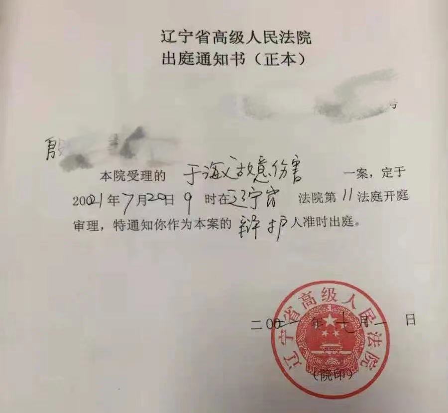 7月1日,据辽宁省高级人民法院书面通知,于海义涉嫌故意伤害一案,定于2021年7月20日9时在辽宁省高级人民法院第11法庭进行二审开庭审理。