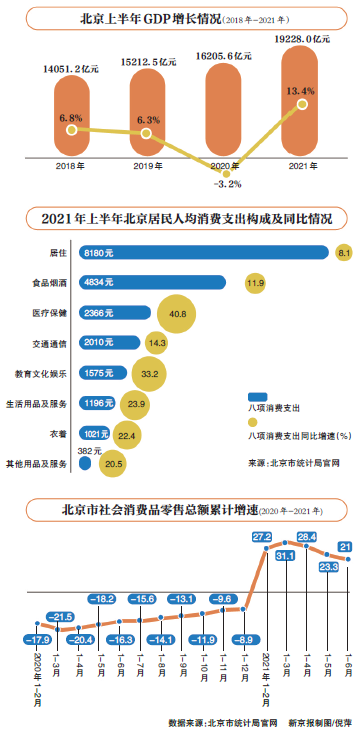 上半年,北京市场总消费额同比增长22.1%,两年平均增长3%。其中,服务性消费同比增长23.1%,社会消费品零售总额同比增长21%。