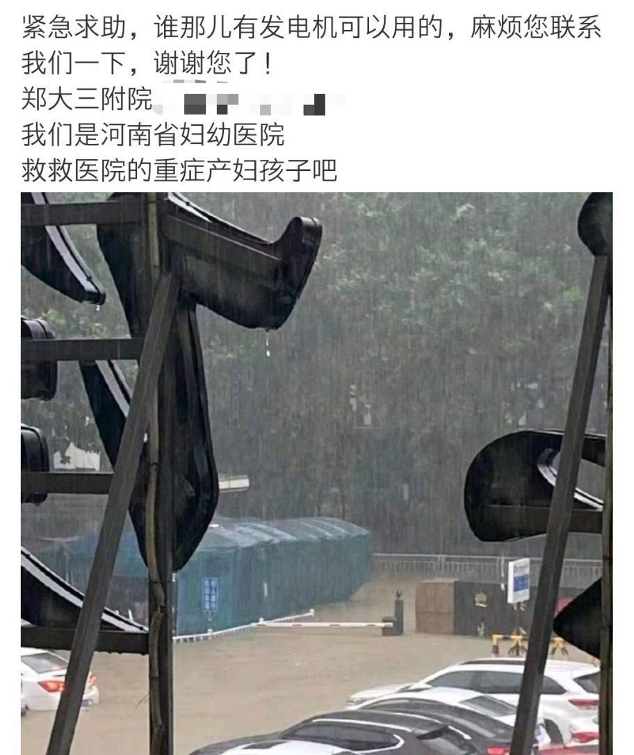 7月20日晚,有网友称郑州大学第三附属医院(河南省妇幼保健院)发电机紧缺。求助信息截图