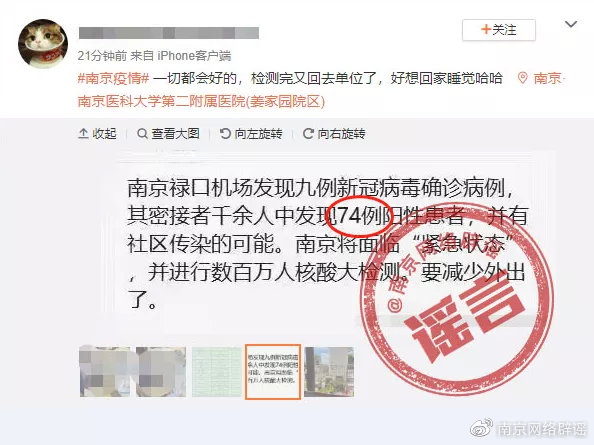 在南京积极应对突发疫情的同时,网络却出现一些不实信息,据@南京网络辟谣消息,网传“南京禄口机场发现确认病例,其密接者千余人中发现74例阳性患者”“新数据已逼近40人”“鼓楼医院查出30多个阳性”“已经70多(阳性)”等,均系谣言。详情>>>