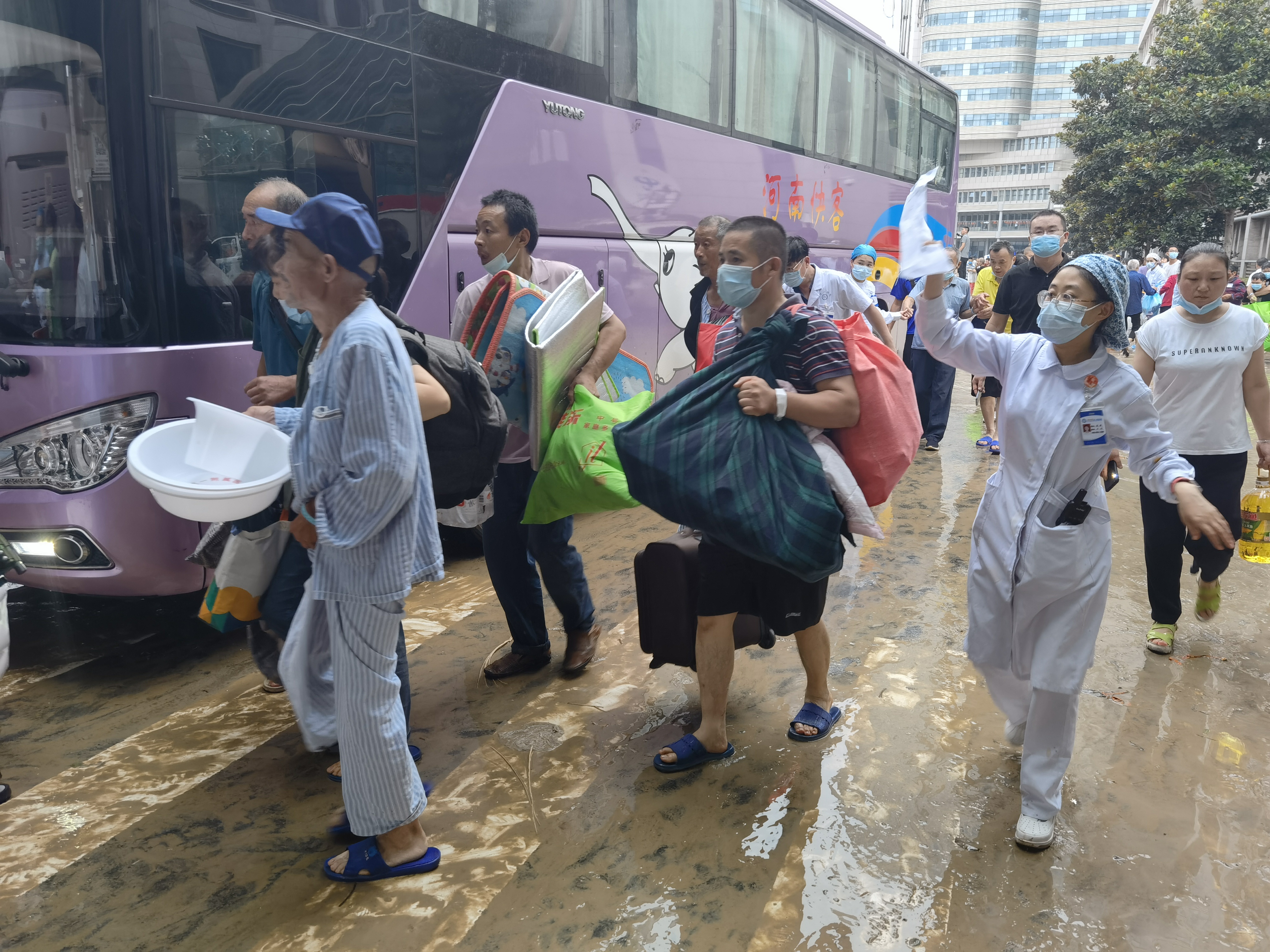 住院楼外,多个科室的护士正组织患者乘坐大巴。一位护士称,“大巴车将把需继续治疗的病人及家属,送往郑东院区。”